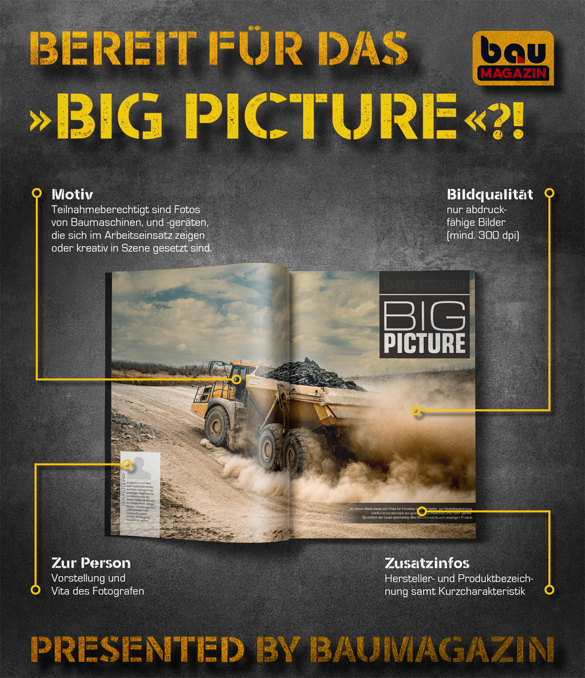 Das bauMAGAZIN bietet Ihnen die einmalige Gelegenheit, Ihre Fotografie einer Baumaschine auf einer Doppelseite in unserem renommierten Printmagazin zu präsentieren. Egal ob Sie ein Profifotograf sind oder einfach nur eine Leidenschaft für das Fotografieren haben, wir möchten Ihre faszinierenden Aufnahmen sehen.