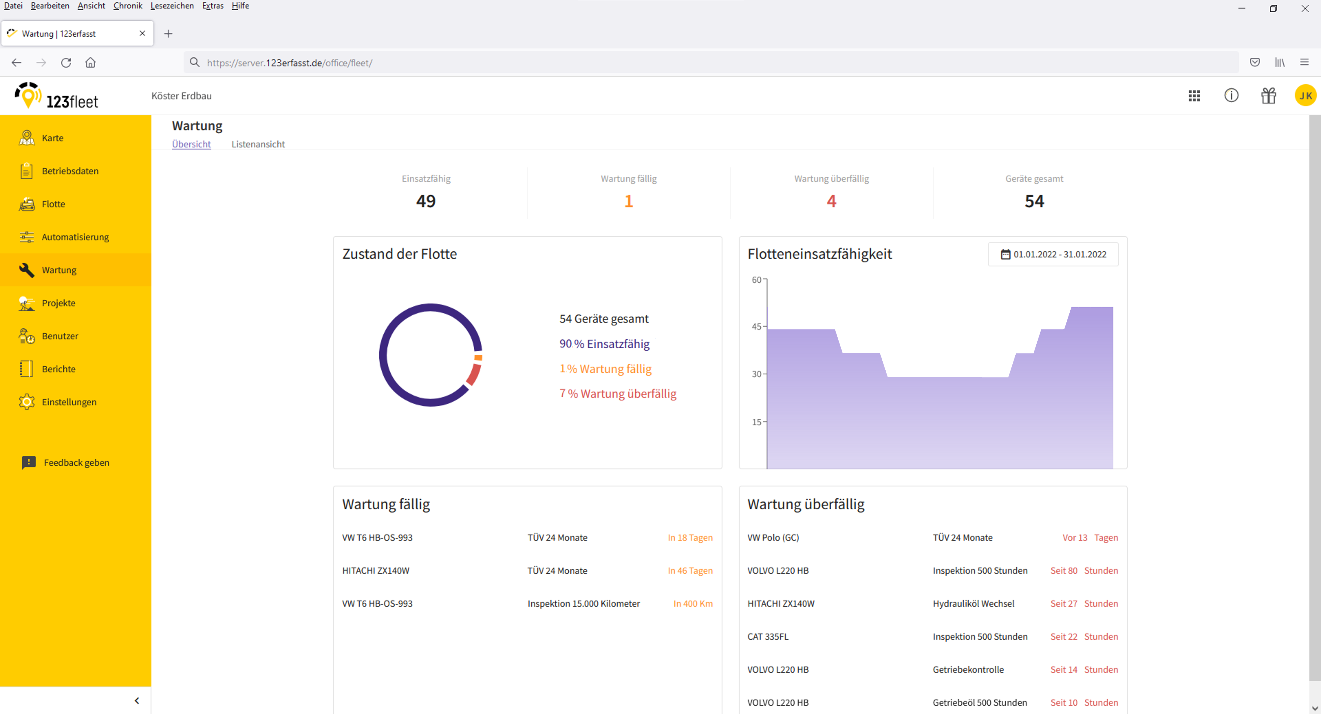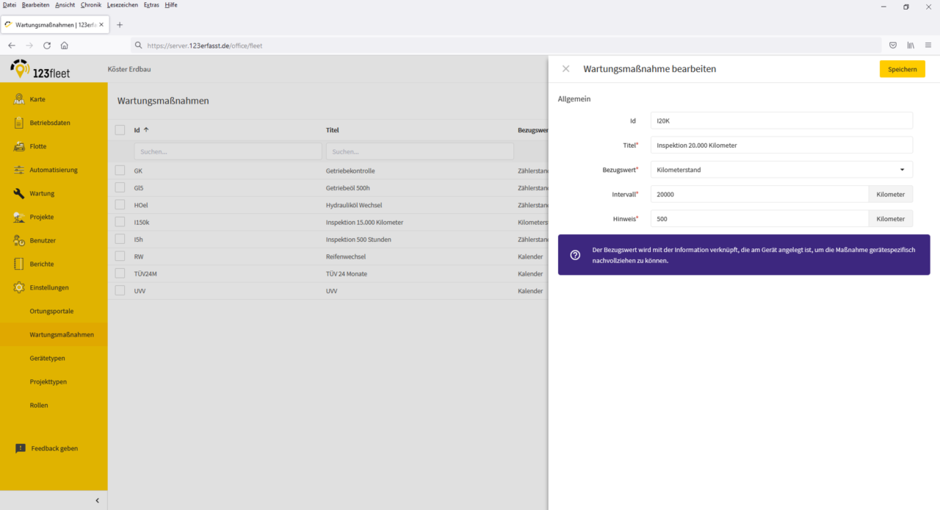 123fleet erlaube größtmögliche Flexibilität, indem sich die Wartungsmaßnahmen frei benennen und anlegen lassen. So können die Maßnahmen je nach Gesetzes- und Unternehmensanforderungen, Gerätetyp oder Herstellervorgabe eingerichtet werden. Eine Übersicht zeige die hinterlegten Maßnahmen und den Status nach Fälligkeit. Ist das Gerät mittels Telematik in 123fleet angebunden, werden unterschiedliche Geräteinformationen automatisch aktualisiert.
