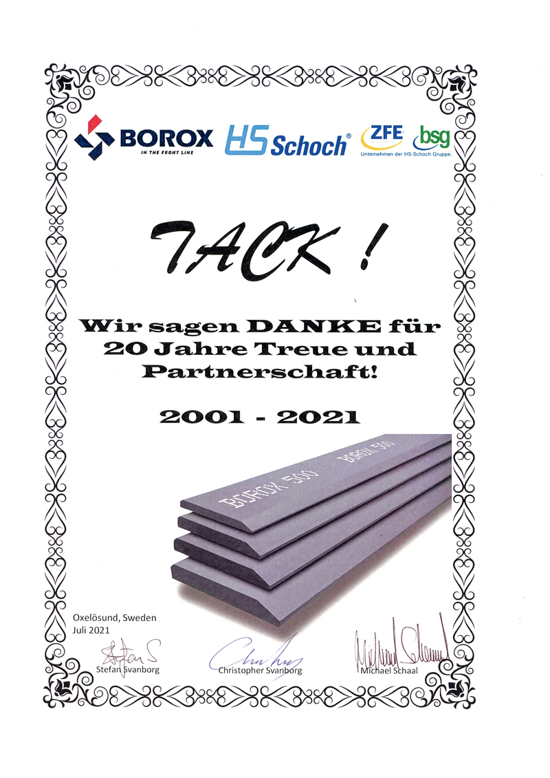Kürzlich galt es für die HS-Schoch-Gruppe, einen besonderen Geburtstag zu feiern – das 20-jährige Jubiläum der Partnerschaft mit Borox, einem der führenden Hersteller von Verschleißprodukten für Erdbewegungsmaschinen.