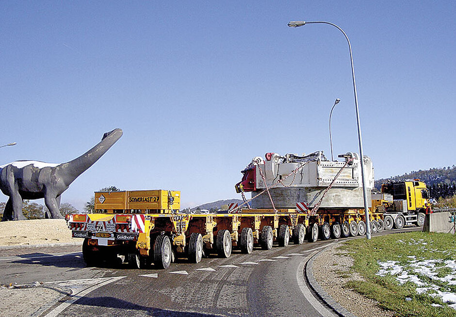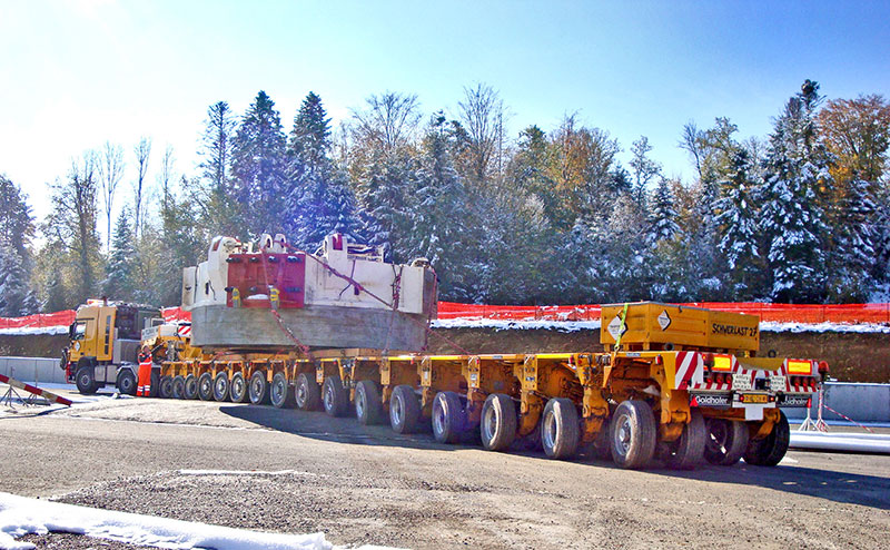Die Transportroute des 160 t schweren Druckgetriebes führte quer durch den Schweizer Kanton Jura und hatte es in sich: Der 4,3 m hohe Koloss mit einem Durchmesser von 6,3 m musste auf den bis zu 20 Goldhofer-Achsen teils millimetergenau über enge Kantonstraßen und über mehrere Autobahnbrücken bugsiert werden. Das technische und logistische Bravourstück wurde am Ende mit viel Erfahrung und besonderer Ingenieursleistung ohne Probleme und ohne Schäden gemeistert. »Wir von Goldhofer sind ja schon so einiges gewohnt, doch das war wieder einmal eine ganz besondere Leistung«, sagt Markus Heinle zufrieden, der bei Goldhofer für die Koordination des »Feldmann-Transports« zuständig war. Sein fachmännischer Rat, das Projektmanagement und das Know-how des Unternehmens wurde auch von den Verantwortlichen des Schweizer Transportunternehmens ausdrücklich gelobt: »Wir können uns auf Goldhofer immer absolut verlassen. So macht es Spaß, neue Herausforderungen zu meistern«, so Marcel Guilbert, Bereichsleiter Transport und verantwortlicher Projektleiter bei Feldmann Pneukran und Transporte.Von Courtedoux (Kanton Jura) bis nach Balsthal im Kanton Solothurn sind es nur 68 km quer durch eine Berglandschaft, die mit dem Pkw in einer guten Stunde zu schaffen sind. Wer diese Strecke jedoch mit bis zu 20 Achsen, einer Gesamtlänge von bis zu 45,5 m und einem Gesamtgewicht von rund 260 t bewältigen muss, hat kaum einen Blick übrig für die Naturschönheiten des Kettenjura. Eine große Hürde stellte sich dem »Feldmann-Transport« gleich zu Beginn, wenige Kilometer nach dem Start in Bure: Zwei Autobahnbrücken der A 16 von Porrenturuy bis Delémont galt es zu überwinden und die Schweizer Behörden ordneten angesichts des hohen Gewichts an, diese Teilstücke mit 20 Achsen zu überfahren. Daher musste der 16-Achser noch einmal um vier zusätzliche Achsen erweitert werden, um die Achslast zu verringern. Mit dem modularen Schwerlastsystem THP/ET von Goldhofer war das allerdings »eine unserer leichteren Übungen«, wie Heinle betont.Kostensenkung