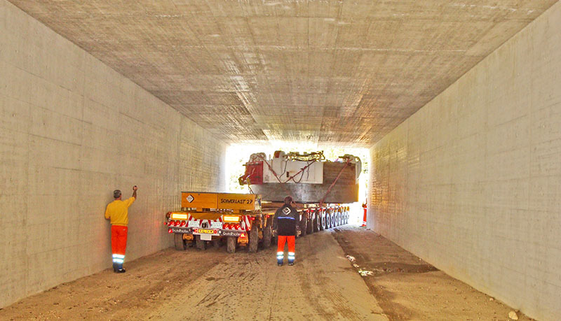 Jetzt zahlte sich auch die minutiöse Vorarbeit der Feldmann-Verantwortlichen aus: Die zuständige Montagegruppe hatte sich mehrere Wochen lang auf den »Tag X« vorbereitet: Alle störenden Elemente wie Markierungspfosten, Straßenschilder bis zu ganzen Ampelanlagen waren rechtzeitig entfernt oder kurzfristig abgebaut worden, sodass alle Voraussetzungen für einen »reibungslosen Ablauf« gegeben waren. An besonders engen Passagen war es notwendig, via Funkfernsteuerung in die Achssteuerung der Module manuell einzugreifen und den Transport so problemlos um engste Radien zu bringen.Die Zusammenarbeit mit den lokalen Behörden war aus Sicht der Transportspezialisten vorbildlich und konstruktiv. »Auch das war ein wesentlicher Mosaikstein für das Gelingen des Projekts«, macht Marcel Guilbert deutlich. Zwar hatte es einiger Überzeugungsarbeit bedurft, doch am Ende gaben die Behörden in der Region Basel sogar grünes Licht für die Befahrung von Straßen, die eigentlich nicht für Transporte mit einer so hohen Tonnage zugelassen sind. Für Feldmann war der 260-t-Transport unter erschwerten Bedingungen eine Premiere der besonderen Art, nie zuvor hatte das Unternehmen eine Nutzlast von 160 t transportiert.