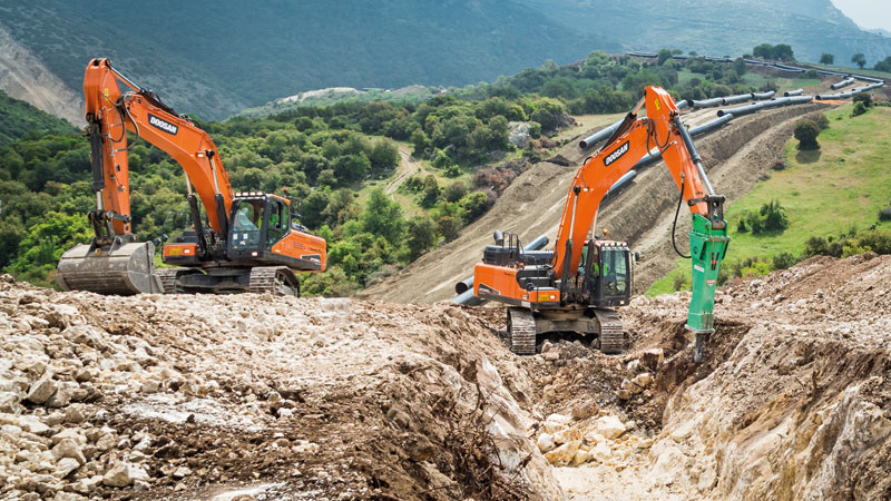 Doosan-Bagger kommen bei dem TAP-Projekt in unterschiedlichsten Anwendungsbereichen und unter erschwerten Bedingungen zum Einsatz. Dazu gehören die Tätigkeiten Planieren, Baumbeseitigung und Flächenräumung, Anheben und Platzieren von Gasrohren, Grabenaushub mittels Hydraulikhammer oder Löffel bis hin zum Beladen von Zerkleinerungs- und Siebanlagen, um für die Gräben Verfüllmaterial herzustellen, das die Rohre nicht beschädigt.