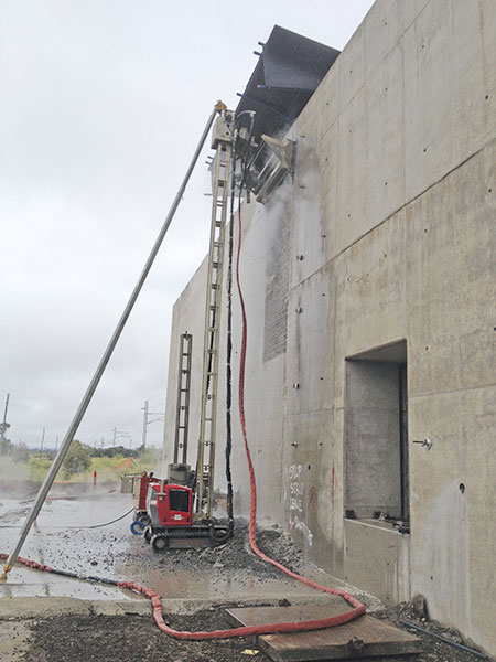 Der HVD-6000, der über eine vergleichbare 3D-Eigenschaft verfügt, wurde mit einem Standard-5-m-Mast ausgestattet.»Hinter der Baustelle befand sich eine 32 000-V-Schiene, die für den Kohlentransport benutzt wurde. Die Schiene befindet sich gerade mal 2 m hinter der Mauer«, so Turner. »Wir haben vorgeschlagen, eine 8 mm dicke Stahlplatte hinter der Mauer anzubringen, die durch Verschalungen und Trägern gestützt wurde, damit fliegende Trümmer nicht auf die Züge schlagen. Ebenso bewahrte die Platte den Strahl davor, auf die Stromkabel zu treffen. Abgesehen von der Geschwindigkeit und dem Vorteil der Beseitigungsmenge durch die Verwendung von Abbruchtechnologien durch Wasserkraft, half uns die Idee mit der 8-mm-Schutzplatte, den Auftrag zu bekommen. Es war wichtig, dass die Züge weiter betrieben werden konnten.« Der Wert einer vollen Zugladung wird auf umgerechnet rund 2,4 Mio. Euro geschätzt. Somit sei es wichtig gewesen, sicherzustellen, dass es zu keinen Verzögerungen kam.