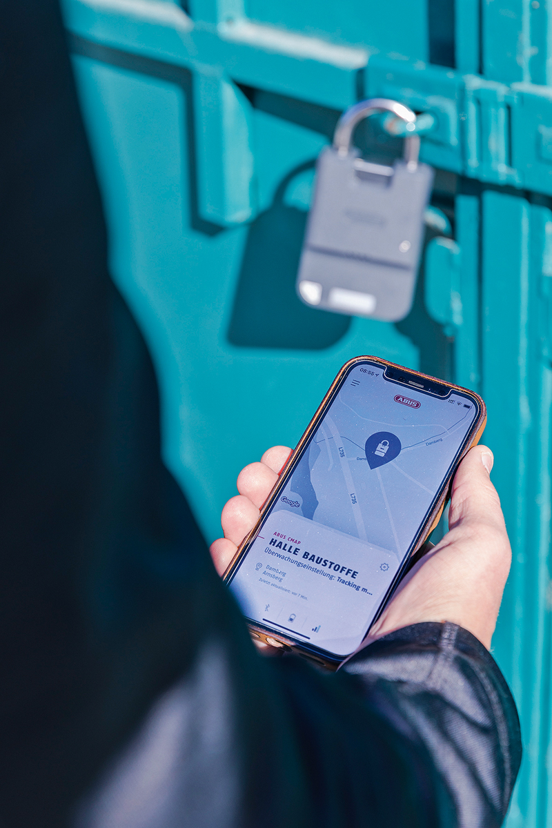 Ein zentrales Element für cMap stellt das smarte Schließmodul 9001 IoTect dar (das bauMAGAZIN berichtete bereits kurz in Heft 12/21, Seite 99). Es wirkt wie ein futuristisches Vorhängeschloss und beinhaltet neben dem Schlosskörper, in dem auch die digitale Kontrolleinheit untergebracht ist, ein Sicherungselement, das es in diversen Formfaktoren (Kabel, Bügel, Kette) gibt. In Verbindung mit cMap lassen sich u. a. Zutrittsberechtigungen vergeben, ein Geo-Fencing festlegen, einzelne Zugriffe dokumentieren oder auf der Baustelle befindliche Fahrzeuge und Geräte tracken. »Der Anwender erhält ein umfassendes Sicherheits-Tool, das auf neuester Technologie basiert, gleichzeitig aber anwendernah und bedienfreundlich entwickelt wurde«, urteilt Hintzpeter. Das Schloss IoTect 9001 erlaube darüber hinaus vielfältige Einsatzzwecke: Neben dem Tracking ließen sich auch Push-Nachrichten an die cMap-Plattform senden. Zudem lasse sich definieren, in welchem Bereich einzelne Nutzer über Zutrittsberechtigungen verfügen, um ein Schloss zu öffnen oder für andere zu sperren.