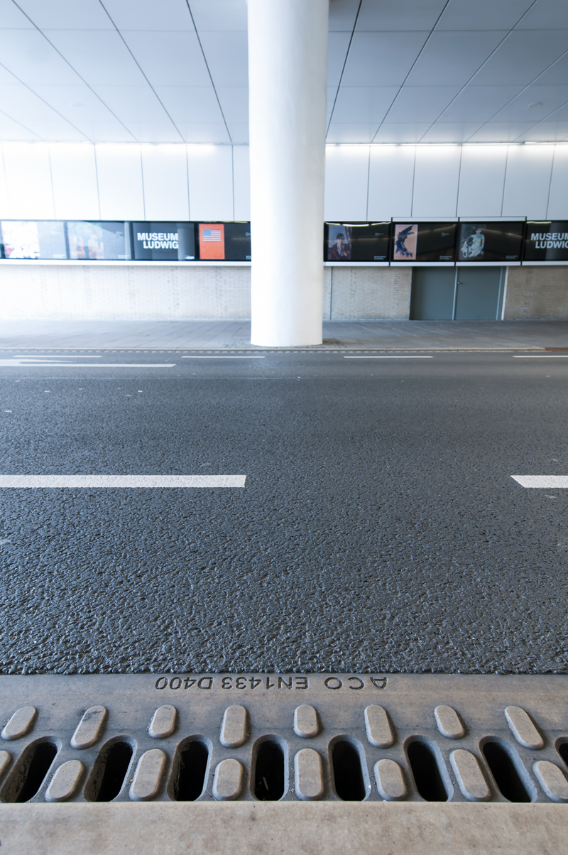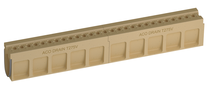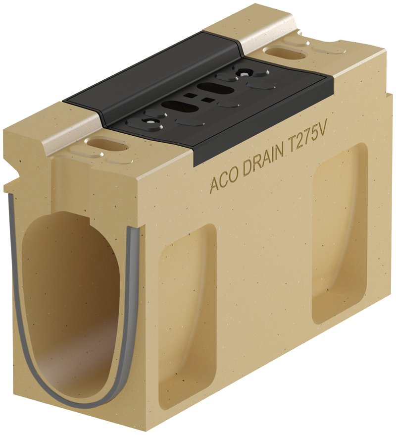 Anders als herkömmliche Schlitzrinnen verfügt die ACO DRAIN® Monoblock Bordschlitzrinne T 275 V nicht über einen durchgehenden Einlaufschlitz. Der Rinnenkopf ist mit mehreren einzelnen Schlitzen versehen. Noppen auf den Zwischenstegen erhöhen die Rauigkeit der Rinnenoberfläche und bieten so mehr Sicherheit für Rollstuhlfahrer, Radfahrer und Motorradfahrer beim Längsfahren und Queren der Rinne, gerade beim Einsatz in innerstädtischen Tunneln.