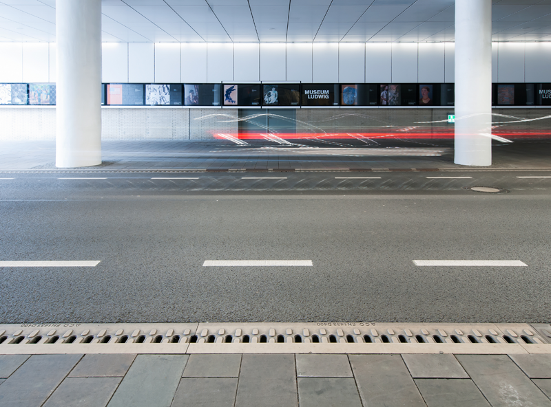 Die Installation der ACO DRAIN® Monoblock Bordschlitzrinne T 275 V bei der Sanierung des Tunnels Köln Domhof gewährleistet eine schnelle und sichere Entwässerung. Die aus Polymerbeton gefertigten Rinnenelemente verfügen bei ähnlicher Dichte über wesentlich höhere Festigkeitswerte und ein geringeres Gewicht als vergleichbare Betonprodukte. Durch das niedrige Fertigteilgewicht der 2,0 Meter langen Elemente von nur 483 kg konnten die Rinnenelemente, trotz der beengten Verhältnisse, mit kleinem Hebegerät unkompliziert transportiert sowie schnell und präzise verbaut werden.