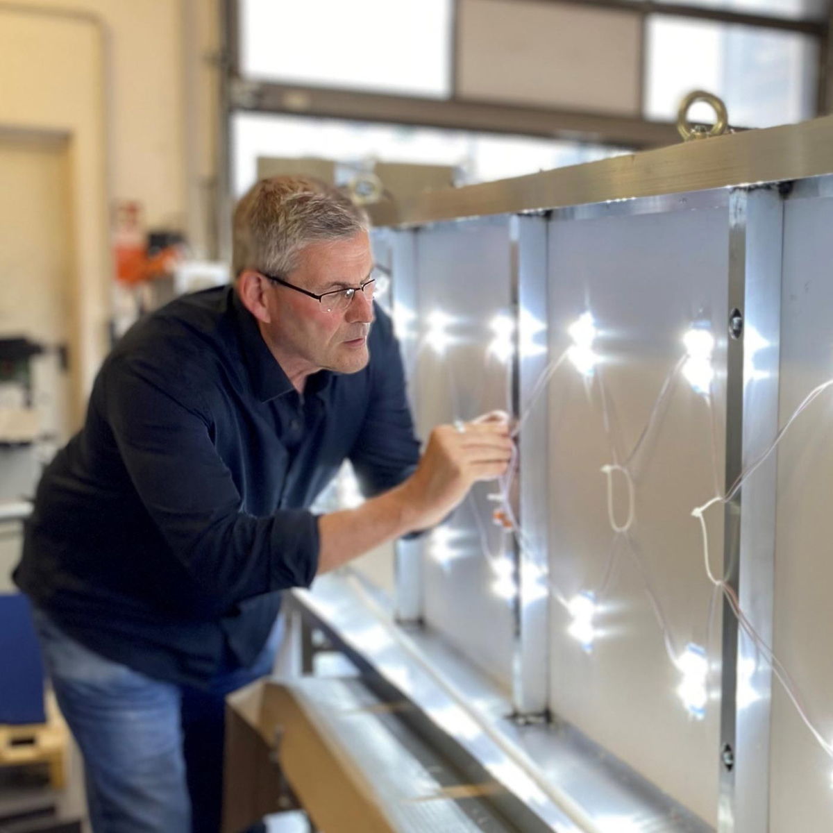 Um diese Problematik zu lösen, wurde eine 2-reihige, geschlitzte Aufnahmeschiene entwickelt, die rückseitig am Kranleuchtschild angebracht wird. Diese ermöglicht die schnelle und einfache Befestigung passender Stahlhalter für den jeweiligen Krantyp. Für die Turmmontage bietet ActivWerbetechnik zudem spezielle Einhängehalterungen an, die eine sichere Anbringung direkt am Kranmast gewährleisten.