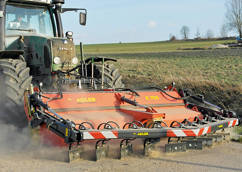 Die Kratzvorrichtungen der Adler KV-Serie beugen dem vor. Überall da, wo starke Verschmutzungen durch Erdreich und lehmige Böden ein einfaches Fegen schwierig machen, eignet sich die Adler KV-Serie für den Einsatz. So kann die Kratzvorrichtung beispielsweise separat vor den Schlepper oder Radlader angebaut oder mit einer Adler Kehrmaschine kombiniert werden. Ebenfalls möglich ist es, bei einer Fahrt mit dem Schlepper vorne zu kratzen und hinten zu fegen.