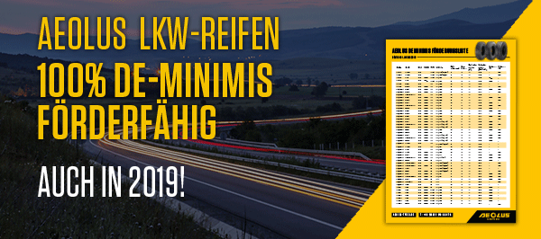 „Wir freuen uns auf eine wieder erfolgreiche gemeinsame Nutzung und Einsetzung der vielen top förderfähigen Aeolus LKW-Reifen", sagt Jeroen Vos, Produktmanager Aeolus. „Die Regelung wurde bereits am 1. Januar 2018 eingeführt. Sie fallen deshalb weiterhin unter Ziffer BAG 1.3 für eine 100%-ige Förderung (mit Anrechnung 80% des Kaufpreises) im Rahmen der DE-minimis-Regelung. Somit erfreuen sich Aeolus Nutzfahrzeugreifen einer kontinuierlichen Attraktivität auch im Jahre 2019.”