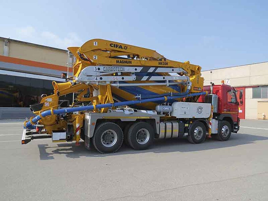 Die MK25H ist eine Autobetonpumpe mit vierteiligem Ausleger – die letzten beiden Abschnitte sind aus Carbon gefertigt – und Z-Faltsystem, die auf vier Achsen montiert wird. Die hochverschleißfeste Förderleitung ist 100 mm stark (eine 2-Lagen-Verrohrung zählt zur Standardausstattung), die aus hochwiderstandsfähigem Stahl gefertigte Trommel bietet ein Fassungsvermögen von 7 m³. Dank der beiden aus Carbon gefertigten Auslegerabschnitte ermöglicht die MK25H den Transport von mehr Beton pro Fahrt. »Die MK25H kann 5 m³ Beton transportieren und bleibt dabei dennoch unter der Gesamtgewichtgrenze von 32 t«, betont Mario Merner, Geschäftsführer von Zoomlion Cifa Deutschland.Die neue Pumpengruppe 607 CC EPC mit geschlossenem Kreislauf wird elektronisch gesteuert und soll einen überaus flüssigen und linearen Betonguss ermöglichen, den Verbrauch begrenzen und die Lärmentwicklung wie auch die Schwingungen des abschließenden Endschlauchs während des Pumpvorgangs verringern. »Wie auch schon bei den Autobetonpumpen bewährt, verfügt die MK25H über das Diagnose- und Abstützsystem Smartronic und ist damit selbstredend EN 12 001 konform. Das gibt den Betreibern die notwendige Sicherheit«, so Merner weiter. Der Ausleger benötigt zum Ausfalten lediglich eine Höhe von 5,2 m.