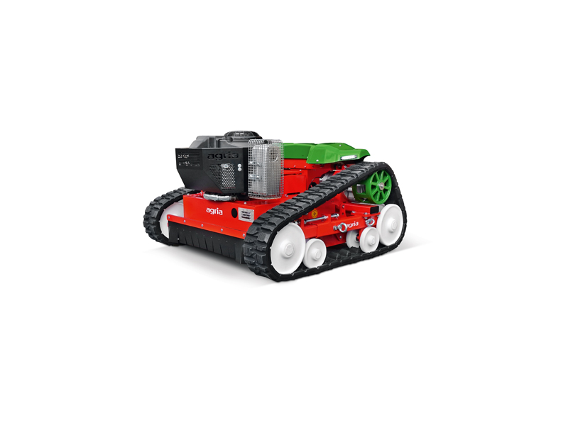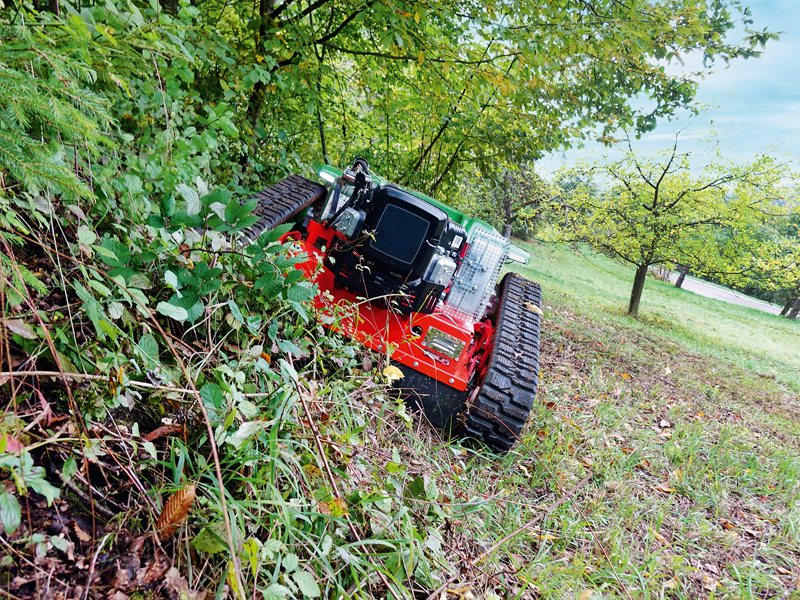 Dabei sorgt der Kawasaki-Motor mit 12,7 kW (17,3 PS) für die benötigte Leistung. Er erlaubt das Mähen von Steillagen bis zu 50°, beispielsweise entlang von Straßen, Rückhaltebecken oder Bahntrassen. Um die Haftung auch auf feuchtem oder lockerem Untergrund zu behalten, können Raupenbänder mit griffigem Ackerstollenprofil zusätzlich unterstützen.