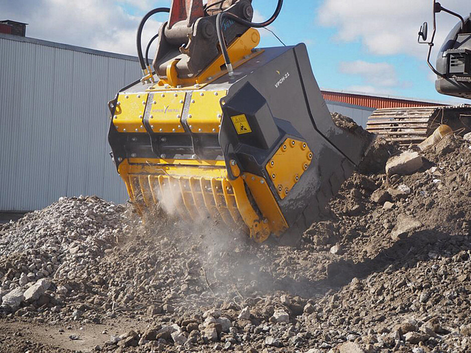 Beim Viper VPCH 21 handelt es sich um einen Ein-Trommel-Brecherlöffel, dessen mit 40 min¯¹ relativ langsam laufende große 700-mm-Trommel über Hartmetallspitzen verfügt und das Material gegen ein Gegenschild schlägt. Kommt der untere Gitterrost zum Einsatz, kann der Viper-Brecher die Fragmentierung von 0 – 150 mm im Standard auf 0 – 40 mm reduzieren. Beim größeren Modell VPCV 22 handelt es sich um einen Zwei-Trommel-Brecherlöffel, bei dem sich die Trommeln in entgegengesetzter Richtung drehen und das Material zwischen den Trommeln zerkleinern.