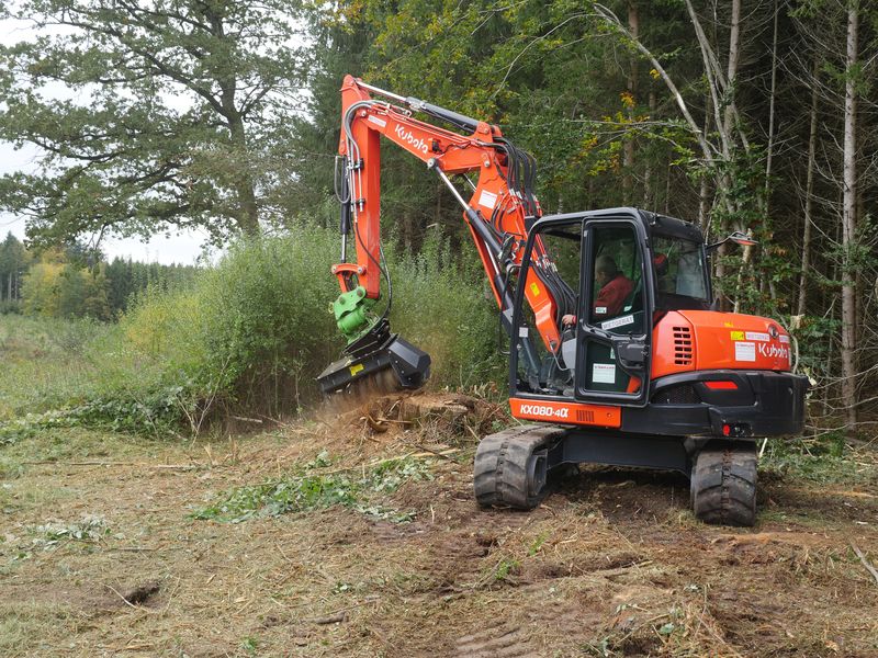 Der M450e-1090 deckt ein Spektrum an Baggern von 8-15 t sowie Trägerfahrzeuge mit Ausleger bis max. 90 PS ab und erweitert somit die Kapazität der M450e-900 (6-12 t). Das Gewicht ist mit 495 kg stark optimiert und macht die Handhabung sehr leicht. Durch zweistufige Gegenschneiden am Materialeingang, die das Blockieren des Rotors durch große eingezogene Holzstücke verhindern, wird der Kraftbedarf reduziert. Dank der eingesetzten Zahnradmotoren ist keine Leckölleitung erforderlich – somit kann die Maschine ohne zusätzlich Umbaumaßnahmen an jeden Baggerausleger angebaut werden: „Plug & Mulch“.