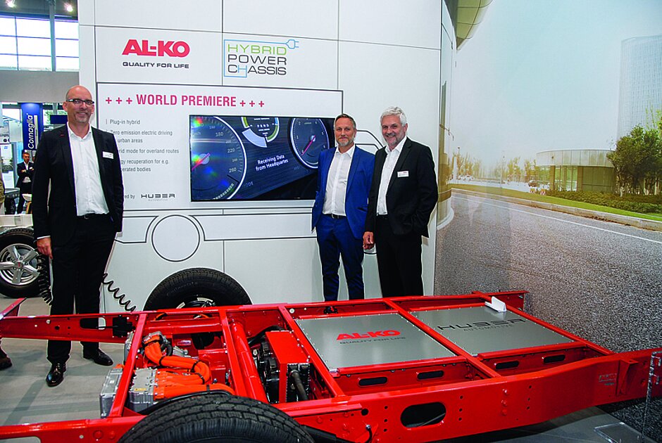 das Hybrid Power Chassis. Das Hybridsystem mit Plug-in-Technologie biete mit zulässigen Gesamtgewichten zwischen 3,5 t und 5 t »die perfekte Lösung für emissionsfreie urbane Fahrten mit Elektroantrieb und längere, außerstädtische Touren mit Verbrennungsmotor«, so Hans Posthumus, Vice President Marketing Al-KO Fahrzeugtechnik. Die elektrifizierte Hinterachse mit einer Leistung von circa 90 kW kann bei Bedarf zugeschaltet werden und macht den Transporter damit zum ersten leichten Hybrid-Nutzfahrzeug.