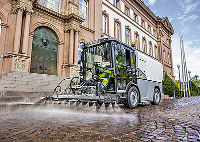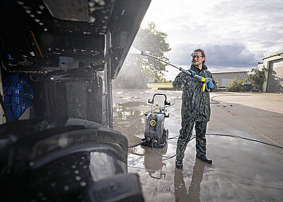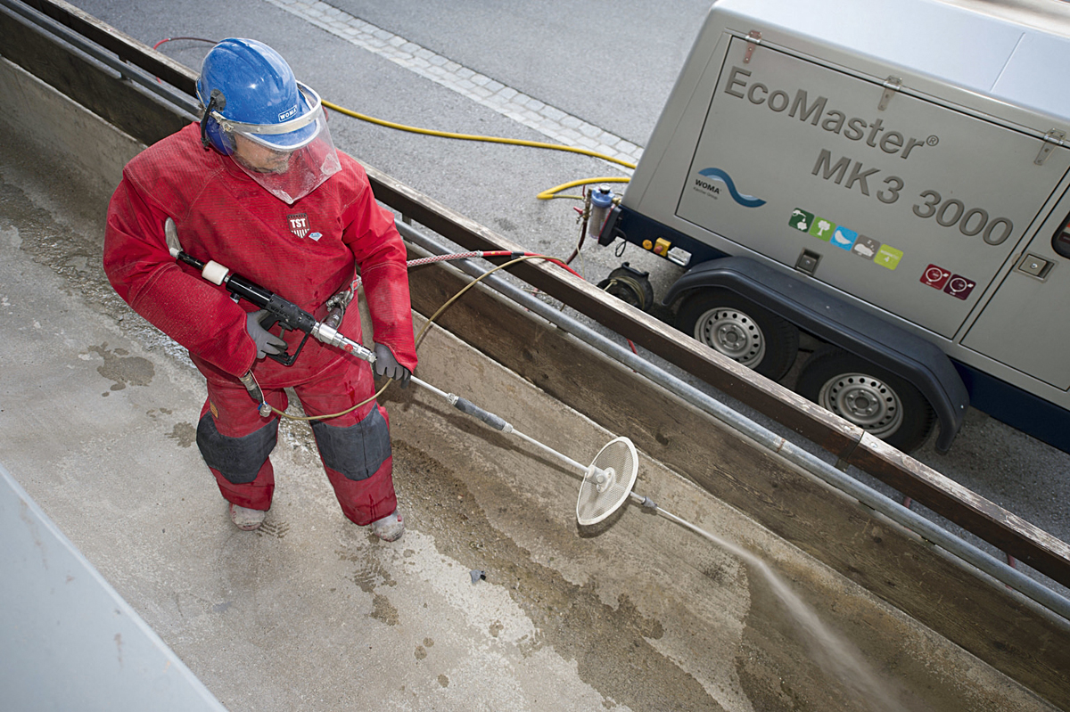 Liegt die körperliche Belastung jenseits des für manuelle Sanierungsarbeiten erlaubten Bereichs, so ist der Einsatz von Robotik möglich. Dank automatisierter Lösungen lässt sich ein bestandsschonender Abtrag von korrosivem Beton sogar großflächig und effizient durchführen. Projekte, die beim handgeführten Arbeiten mehrere Wochen in Anspruch nehmen, lassen sich auf diesem Weg binnen weniger Tage erledigen. Meist bringt die Kombination aus einem verhältnismäßig niedrigen Betriebsdruck von etwa 1 300 bar in Verbindung mit hohen Fördermengen von 200 l/min gute Ergebnisse.