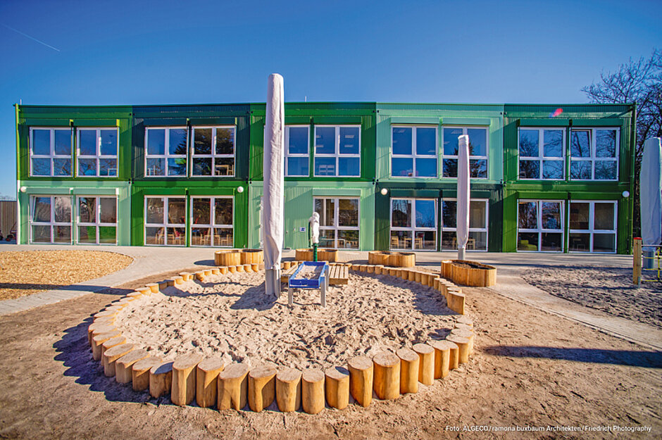 Ramona Buxbaum Architekten aus Darmstadt haben insgesamt 60 Containermodule in unterschiedlichen Grüntönen zu einem zweistöckigen Gebäude verbunden. Eine Gesamtnutzfläche von rund 1 080 m² bietet rund 130 Kindern in sechs Kita-Gruppen genügend Raum zum Spielen und Entdecken.