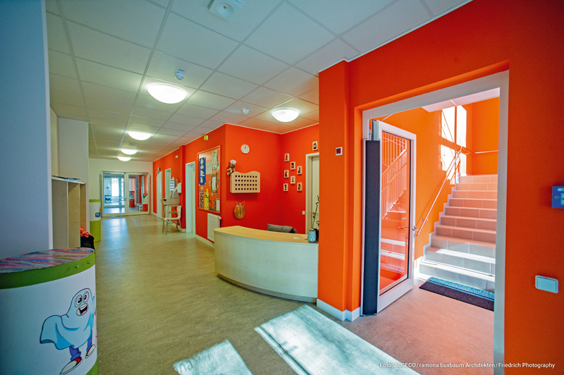 Spätestens beim Betreten der Kita sollen die Erinnerungen an Container entschwinden und einem angenehmen Wohlfühlambiente Platz machen. Große Fensterfronten nach Westen lassen die Räume großzügig erscheinen und sorgen für eine angenehme Helligkeit. Wände in unterschiedlichen Farbtönen von leuchtend bis dezent sowie hochwertige Böden aus Linoleum und Keramik sollen zudem das angenehme Raumgefühl weiter unterstreichen. Zahlreiche Extras, bei Algeco Bestandteil des »360°-Service«, verweisen auf eine Einrichtung im Trend der Zeit. So verfügt die Kita in Modulbauweise über eine Lichtkuppel, Sonnenschutzanlagen, Klingelanlagen mit Videofunktion, zudem über elektrische Türöffner, Präsenzmelder und ein Data-Net-Modul für moderne Netzwerk- und Telekommunikationslösungen. t