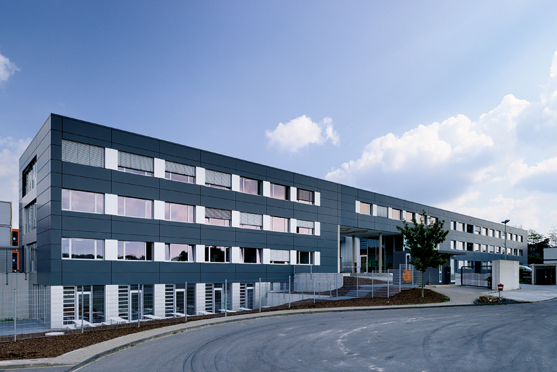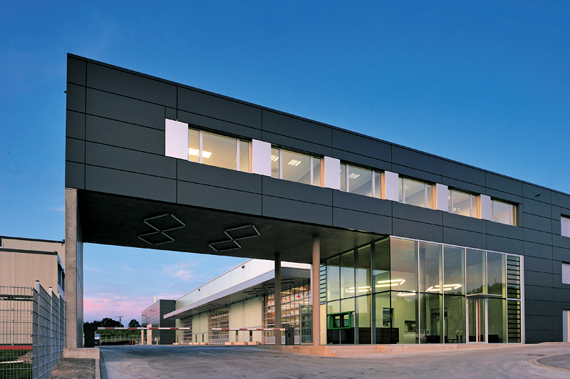 Die ALHO-Modulbauweise bietet eine hohe Flexibilität. Ihre anpassungsfähige Struktur steht für jederzeit nutzungsbedingte Veränderungen. Selbst die teilweise oder komplette Umsetzung eines Gebäudes an einen anderen Standort wäre möglich. Die Baustellen modularer Gebäude sind sauber und leise und können darum bei fortlaufendem Betrieb erfolgen. Dass die Architekten eine mögliche Erweiterung des Fagsi-Firmenkomplexes von Anfang an einplanten, das Gebäude auf dem Firmengelände vorausschauend platzierten und die systembedingten Vorteile der Modulbauweise nutzten, zahlte sich sieben Jahre später aus: In nur 14 Wochen entstand ohne nennenswerte betriebliche Einschränkungen der Erweiterungsbau in Verlängerung des einspännigen Bestandsgebäudes. Auf ein betoniertes Untergeschoss wurden 24 vorgefertigte Raummodule montiert und im Anschluss ausgebaut. 1 300 m² Gebäudefläche mit Büroräumen unterschiedlicher Größe, Sanitär- und Lagerflächen verteilen sich auf drei Modulbau-Geschosse. Weitere 230 m² stehen im Untergeschoss (UG) für Kantine, Personalräume und Technik bereit. Während das UG rückseitig im Erdreich verankert ist, öffnet es sich Richtung Westen einer Terrasse. In seiner Höhe sowie mit der durchgängigen Flachdachfläche und der Weiterführung der Fassadenbekleidung als dunkle, wärmegedämmte Metallkassetten, setzt der Neubau den Bestand fort. Farblich setzt sich das UG von den anderen Etagen mit einer Metallverkleidung in hellem Silbergrau ab.