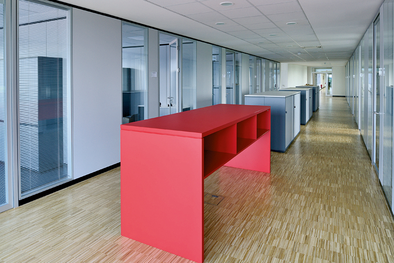 Punkten können Modulgebäude vor allem beim Thema Nutzungsflexibilität und ihrer Anpassungsfähigkeit an sich ändernde Anforderungen. Da sie über eine tragende Skelettstruktur verfügen, die flexible Grundrisseinteilungen und -änderungen ermöglicht und in der Regel alle Innenwände nichttragend ausgebildet sind, können diese frei entfernt oder versetzt werden. Erst bei sehr großen Modulgrößen wird es notwendig, Unterzüge und Stützen einzubringen. Um den Erweiterungsbau an den Bestand anzuschließen, waren ebenfalls minimale bauliche Eingriffe nötig: So wurden im 2. OG über der Lkw-Einfahrt die ursprünglich gebäudetiefen Besprechungsräume zugunsten einer verlängerten Flurachse verschmälert, die nun direkt in den Treppenhausbereich des Neubaus mündet. 13 Büroräume pro Etage schaffen Arbeitsplätze für rund 80 Mitarbeiter. Die Flurzonen dazwischen sind großzügig bemessen und bieten Platz, um eine kleine Sitzgruppe für informelle Treffen und Stauraummobiliar zu integrieren. Auch die Innenraumgestaltung wurde »wie aus einem Guss« fortgesetzt: Hochwertiger Stäbchenparkettboden zieht sich durch das gesamte Gebäude. Statisch ist das Gebäude so vorbereitet, dass eine künftige Erweiterbarkeit auch durch Aufstockung erfolgen kann.