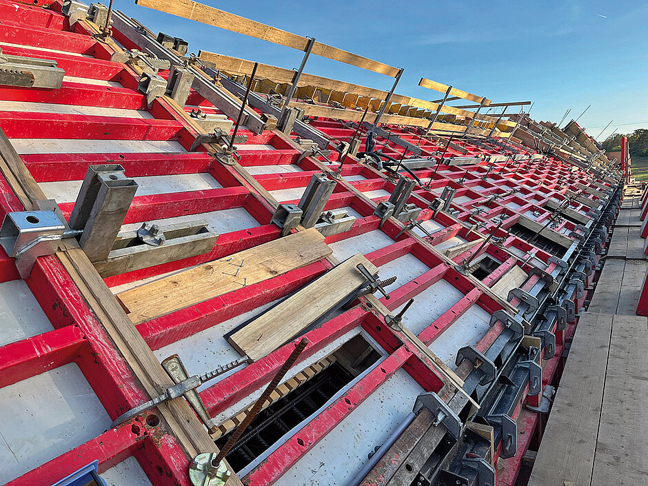 Die flexible Schalungsplatte bezog Kiefer Schalungsbau über den langjährigen Partner Meva Schalungs-Systeme. Außerdem wurde die Außenschalung der Konstruktion mit dem Meva Mammut 350-System (Rahmenschalung) mit verbauten alkus AL Schalungsplatten in 20 mm Stärke realisiert. Das Meva-Schalungssystem wird für den Tief- sowie Hochhausbau verwendet. Es verfügt über ein Kombi-Ankersystem, bei dem zwischen drei unterschiedlichen Ankermethoden schnell gewechselt und somit 30 % Schalzeit eingespart werden kann.