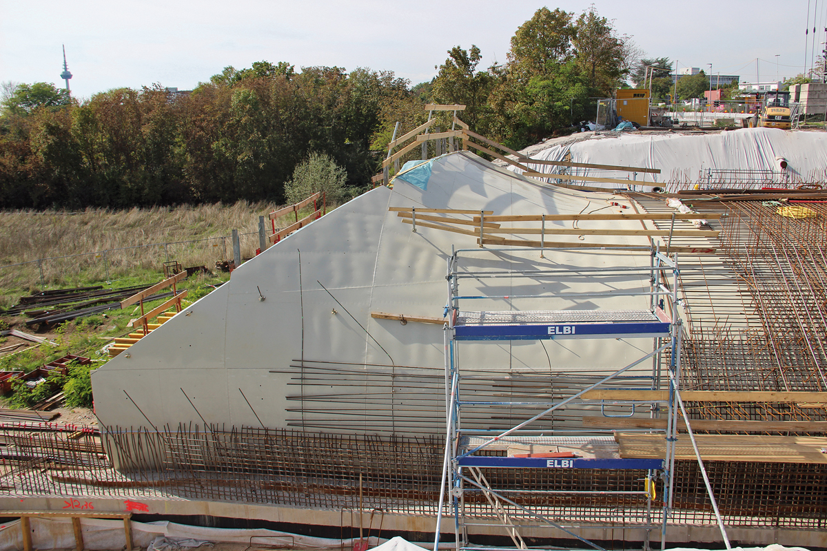 Die konkave Form der 40 m langen Unterführung war rein architektonisch bedingt und stellte für den Sonderschalungsbauer Kiefer Schalungsbau eine Herausforderung dar. Denn beschichtete Mehrschichtholzplatten, die oft beim Sonderschalungsbau zum Einsatz kommen, konnten bei dieser Aufgabe nicht eingesetzt werden. Um die für die gewünschte Form speziellen Rundungen zu erreichen, war ein enger Biegeradius nötig, für den Holzplatten nicht flexibel genug sind.