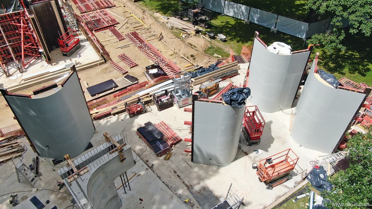 Die Alkus-Vollkunststoffplatten können mit dem gleichen Material (Polypropylen) repariert werden. Außerdem lassen sich Paneele zusammenschweißen, ohne Spuren auf der Betonoberfläche zu hinterlassen. Kratzer, Lücken oder gar Schrauben, die die Elemente auf dem Schalungssystem halten, können geschlossen werden, wiederum ohne Spuren auf der Betonoberfläche zu zeigen. Genau eine derartige Oberfläche wurde von den Architekten gefordert und mit Unterstützung von Alkus als Hersteller der gleichnamigen Platten vor Ort gefertigt.t