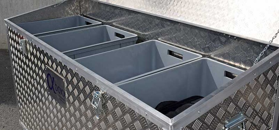 Alle Boxen der Serie AL-MU verfügen über Schrägdeckel aus Alu-Riffelblech, was auch den sicheren Ablauf von Schnee- und Regenwasser unterstützt. Durch den Schrägdeckel ergibt sich eine gerade verlaufende Boxenoberkante. Der über 90° wegklappbare Deckel macht das hindernisfreie Einladen möglich. Die stabile Deckelsicherung sorgt für eine zusätzliche Aufhaltevorrichtung bei Be- und Entladung der Box. Seitenplatten und Böden sind ebenso auf den Verwendungszweck abgestimmt. Die Seiten- und Bodenteile können zudem getauscht werden. Sichere Spannverschlüsse mit Vorrichtung für Vorhängeschloss unterstützen den Diebstahlschutz.