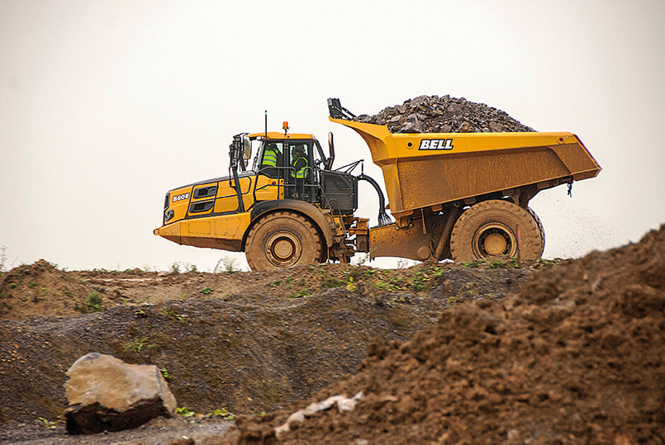 Bell wisse aber aus den Erfahrungen mit seinen Großdumpern B45 und B50, dass Betriebe mit schwieriger Topographie oder sehr wechselhaften Witterungsbedingungen von der großen Wendigkeit eines Knicklenkers und besserer Allrad-Traktion profitieren, so Andreas Reinert. »Vor allem aus diesen Kreisen kamen denn auch die Anfragen nach einem Fahrzeug mit diesen Eigenschaften bei allerdings größeren Kapazitäten im Gesteinstransport.«