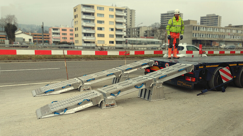 Hierfür wurde Hämmerle auf der anderen Seite des Bodensees fündig: Beim Experten auf dem Gebiet für Verladetechnik Altec beschäftigt man sich seit knapp 40 Jahren mit leichten bis besonders schwierigen Verladesituationen und setzt auf den eigenen und umfangreichen Profilbausatz aus hochfesten Aluminiumlegierungen. Um die Hämmerle-Aufgabe zu lösen, wurden einzelne Rampenteile entwickelt, die modular an zwei unterschiedlichen Tiefladern von Hämmerle verwendet werden können. Die Konstruktion besteht pro Seite aus drei Rampenteilen und je zwei losen Stützböcken. Für den reibungsfreien Ablauf stand auch eine Aufbewahrungsmöglichkeit und Transportsicherung der mehrteiligen Rampenkonstruktion mit auf der Agenda. t