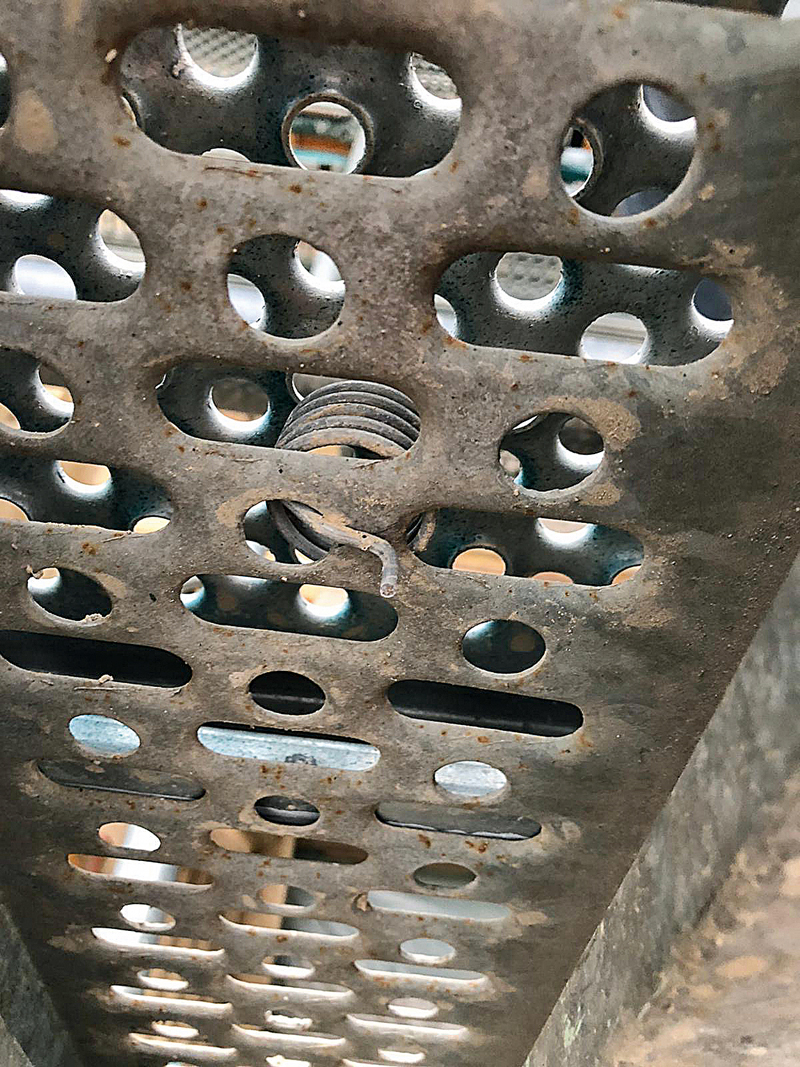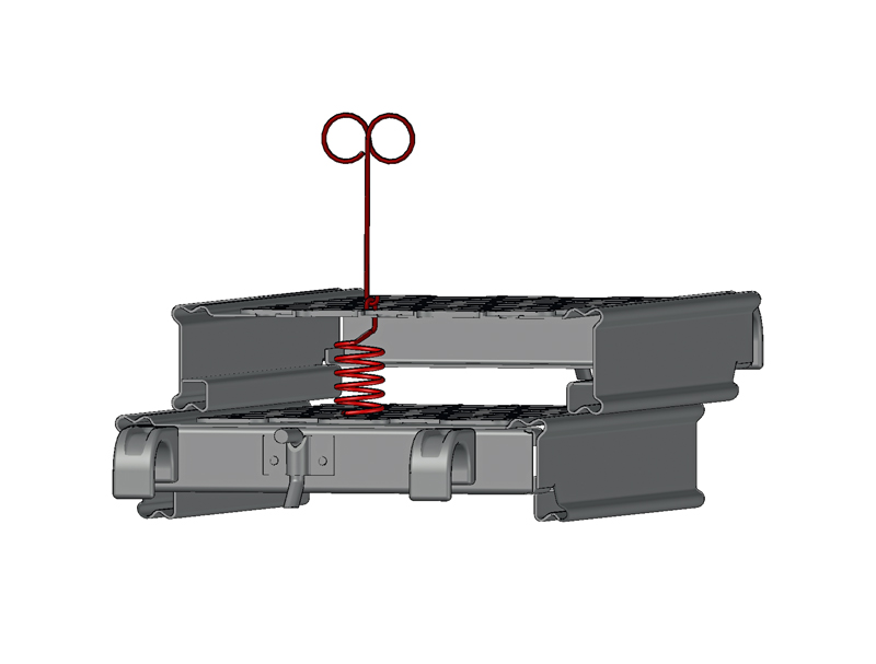 Bei einem beispielhaften Einbau von Systemstahlböden auf Systemstahlböden werden die Federn zunächst fest durch Drehen in der Lochung des unteren Belags montiert und dann mit dem Werkzeug durch die aufgetulpten Löcher des oberen Belags hochgezogen und über den Rand an der Auftulpung befestigt. t