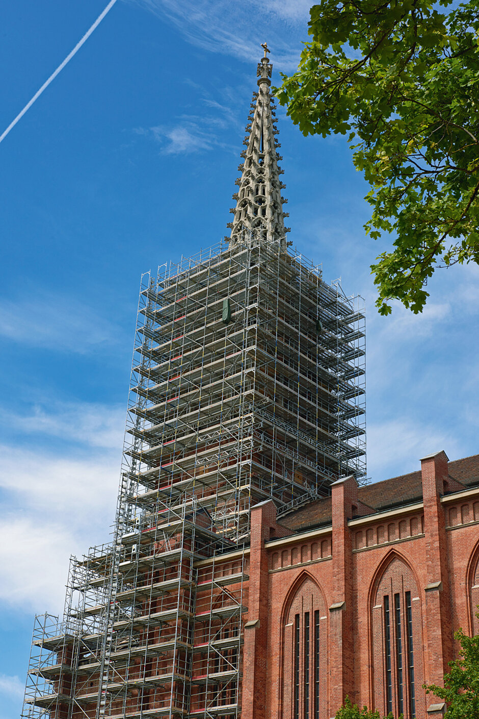 Mit einem besonderen und zugleich typischen Backsteinbaustil sowie mit bunten Ziegeln gedecktem Dach gehört die Mariahilfkirche zu den frühen Vorbildern der neugotischen Kirchenbauweise. Um den sicheren Fortbestand der frei stehenden Kirche sicherzustellen, beauftragte die zuständige Erzdiözese München und Freising für ein sicheres Grundgerüst das heimische Gerüstbauunternehmen Stahlrohrgerüstbau München. Bei einer maximalen Standhöhe von rund 90 m wurden in Summe ca. 6 000 m² Gerüstmaterial eingesetzt, um die aufwendigen Restaurationsarbeiten am Turm, Turmhelm und Glockenstuhl zu ermöglichen. Bei der Wahl der Gerüstsysteme setzte man auf den Gerüsthersteller Altrad Plettac Assco. Ein Mix aus den Fassadengerüsten Plettac SL 100 und Plettac SL 70 sowie dem Modulgerüstsystem Plettac Contur sorgte für einen schnellen und sicheren Aufbau mithilfe von vier Monteuren und einem Bauleiter in nur fünf Monaten.