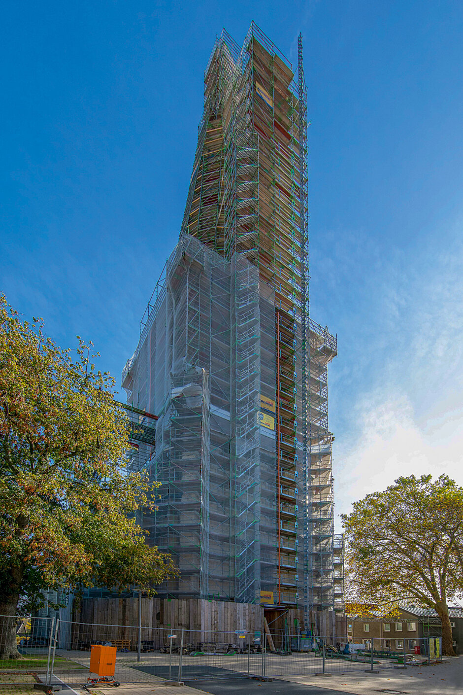 Das Traditionsunternehmen setzte für einen sicheren und bequemen Zugang, vom Sockel beginnend bis zur Turmspitze, auf einen Mix aus den Fassadengerüsten Plettac SL und Modulgerüsten Plettac Contur, um die gewünschten Natursteinarbeiten und Dachdeckerarbeiten durchführen zu können. Das Fassadengerüst Plettac SL punktet mit seiner selbstständigen Lotjustierung, die eine schnelle und sichere Montage gewährleistet. Das Modulgerüst vom Typ Plettac Contur verwenden die Spezialisten von C. O. Weise nach eigenen Angaben immer dort, wo neben hervorragender Standsicherheit auch höchste Flexibilität gefragt ist.