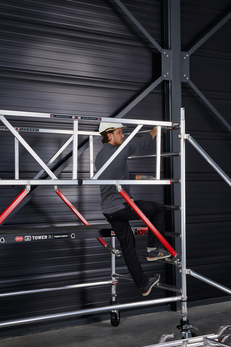 Altrex hat rechtzeitig in die Entwicklung geeigneter Produkte investiert um Ihre Sicherheit zu erhöhen und durch Unfälle verursachte Ausfälle zu reduzieren. Dafür haben wir den innovativen Safe-Quick2® in unsere Fahrgerüste integriert, der maximale Sicherheit garantiert. “Für uns ist es enorm wichtig, unseren Kunden markt- und gesetzeskonforme Lösungen zu bieten, die Komfort und Schutz über dem Standard hinaus ermöglichen” erklärt Eugène Derksen, Geschäftsführer von Altrex B.V. Außerdem entspricht die Leiter Altrex RS TOWER 52-S allen Anforderungen des TÜV gemäß EN1004 Klasse 3.