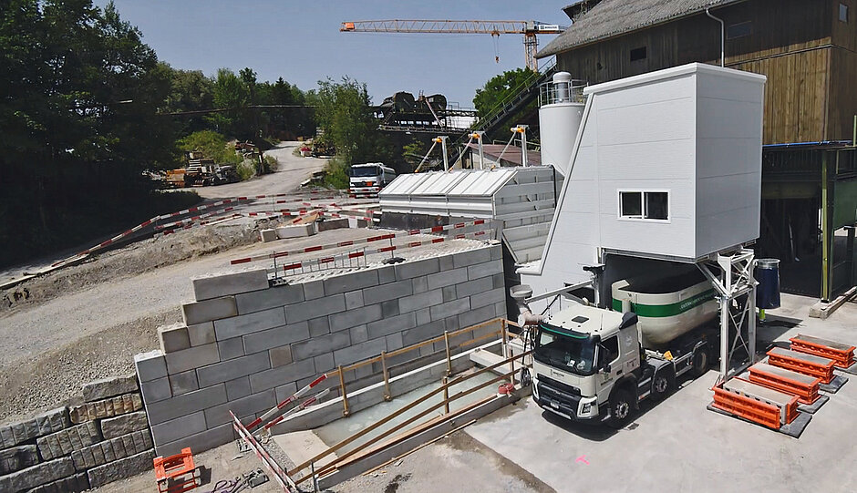 Im Mai vergangenen Jahres begann Ammann mit dem Aufbau der in einem speziellen Faltmechanismus gelieferten CBT 60 Elba. Ein Kübelaufzug bewies sich am Firmenstandort als platzsparende Alternative zum Förderband. Da ressourcenschonende Arbeitsweisen und Nachhaltigkeit in dem nach ISO 14001 zertifizierten Unternehmen Bereuter selbstverständlich sind, wurde auch ein Recycling-Wassersystem eingeplant und vor Ort realisiert. Mit der Einhausung der Anlage waren die Aufbauarbeiten abgeschlossen: Staubemissionen wie auch Lärm werden damit auf ein Minimum reduziert.