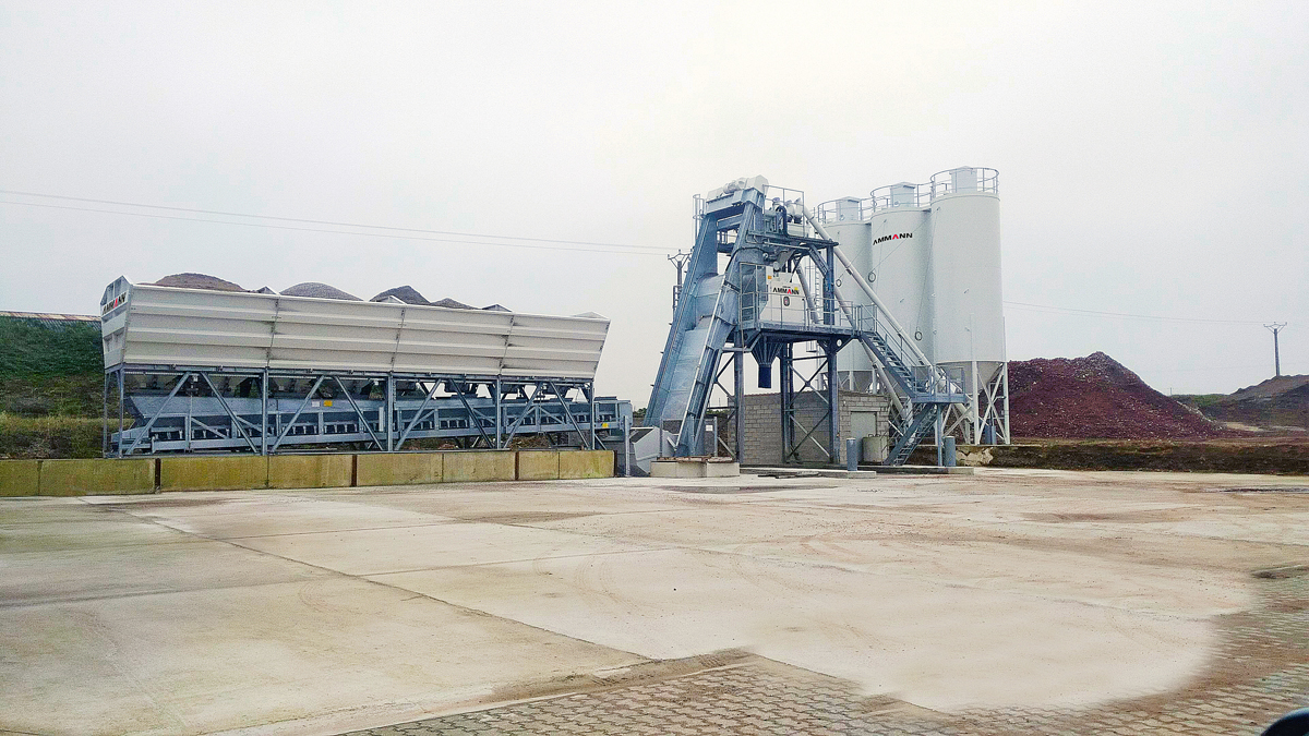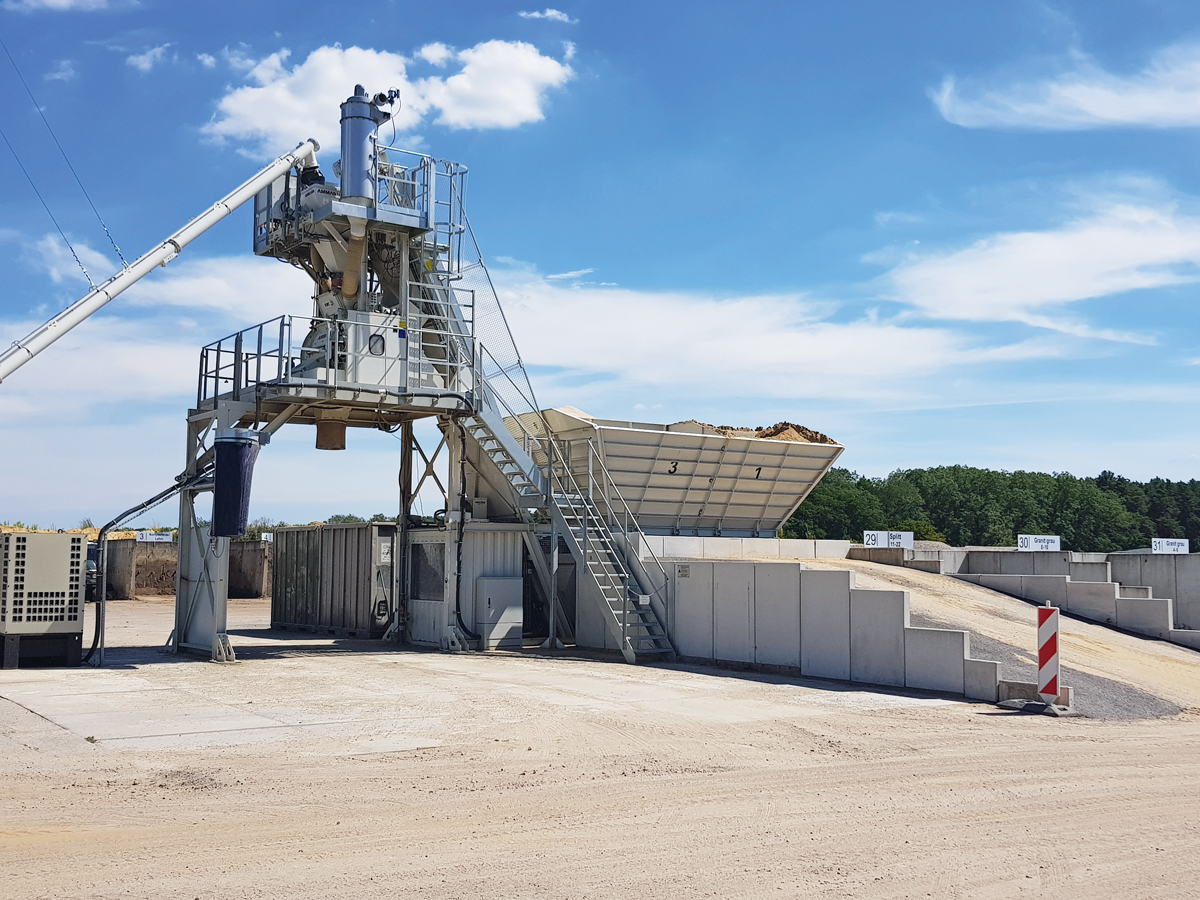 Mit der Betontankstelle CFS 30 SL soll es Recycling-Unternehmen möglich werden, Material aufzuwerten und zu veredeln. Wie bei den großen Transportbetonanlagen werden alle Komponenten separat verwogen und dosiert. Der Einwellenmischer CEM 500 S dient nur dem eigentlichen Betonmischvorgang mit einer Leistung von bis zu 30 m³/h. Der in der Basisversion integrierte 4-fach-Taschenstern mit 10 m³ Volumen erlaubt die Lagerung von vier unterschiedlichen Zuschlagsorten, die über separate Dosierverschlüsse der integrierten Zuschlagstoffwaage zugeführt werden. Die funktionsbereit montierte Zementwaage mit zwei Einläufen erleichtert die Auswahl der geeigneten Zementarten.