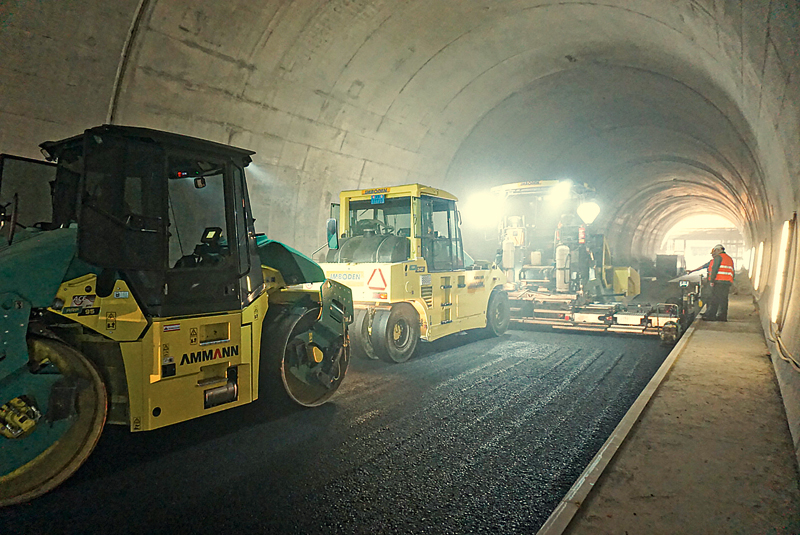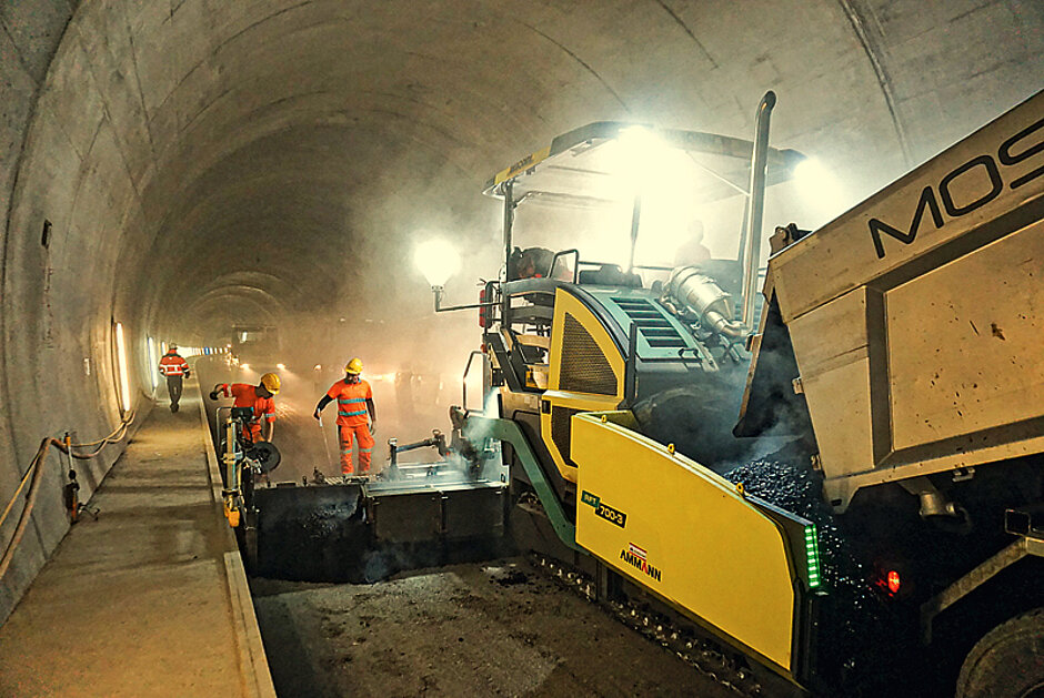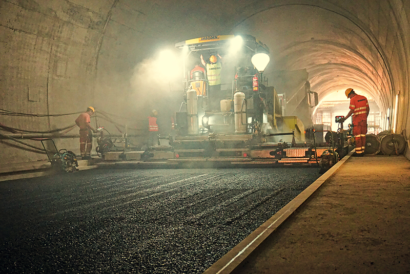 Der Mannschaft wird bei einem derartigen Szenario ein Höchstmaß an Präzision und Produktivität abverlangt, um die Arbeit im geforderten Zeitraum zu stemmen. Da kann zum einen die Höhe des Tunnels das Kippen des Lkw behindern. Zum anderen erfordert die genaue Abfolge der Walzen ein gut eingespieltes Team mit der notwendigen Expertise.