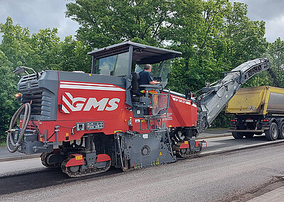 Die Nähe zur Baustelle ist ideal – Lkw benötigen nur wenige Minuten, um das Mischgut zum Fertiger zu transportieren. Mit ihrem Output muss sich die Anlage am aktuellen Bedarf des Asphaltfertigers orientieren. Schließlich ist der AFT 700-3 von Ammann das »Herz« und damit der Taktgeber des gesamten Einbauprozesses, mit ihm kann die Fahrbahn in der Gesamtbreite von 7,3 m in einem Zug asphaltiert werden. Rund 180 °C heiß ist der Asphalt, der vom Lkw in den Fertiger gekippt wird. Er muss so schnell wie möglich und bei gleichbleibender Temperatur verarbeitet werden. Die Temperatur darf unter keinen Umständen unter 70 °C fallen, denn das würde die Verdichtung unmöglich machen.