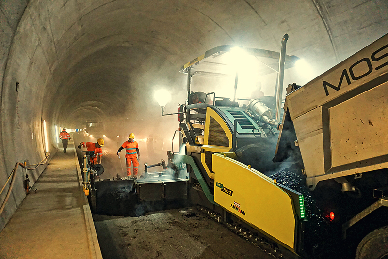 Die Baustelle ist insgesamt 31,8 km lang und mit vielen Herausforderungen gespickt. So führen zwei durch eine Brücke verbundene Tunnel die Autofahrer auf rund 7 km Länge direkt durch die Berge. Gefordert ist eine überdurchschnittlich hohe Qualität des Asphalteinbaus. Für die Deckschicht wird ein besonderer Asphaltmix mit PMB (Polymer Modified Bitumen) verwendet, der durch eine hohe Beständigkeit überzeugt. Eine optimale Verdichtungsleistung ist zudem wichtig, damit Öl, das Fahrzeuge verlieren, nicht in den Untergrund gelangt, sondern in ein Abwassersystem der Tunnel abgeleitet werden kann.