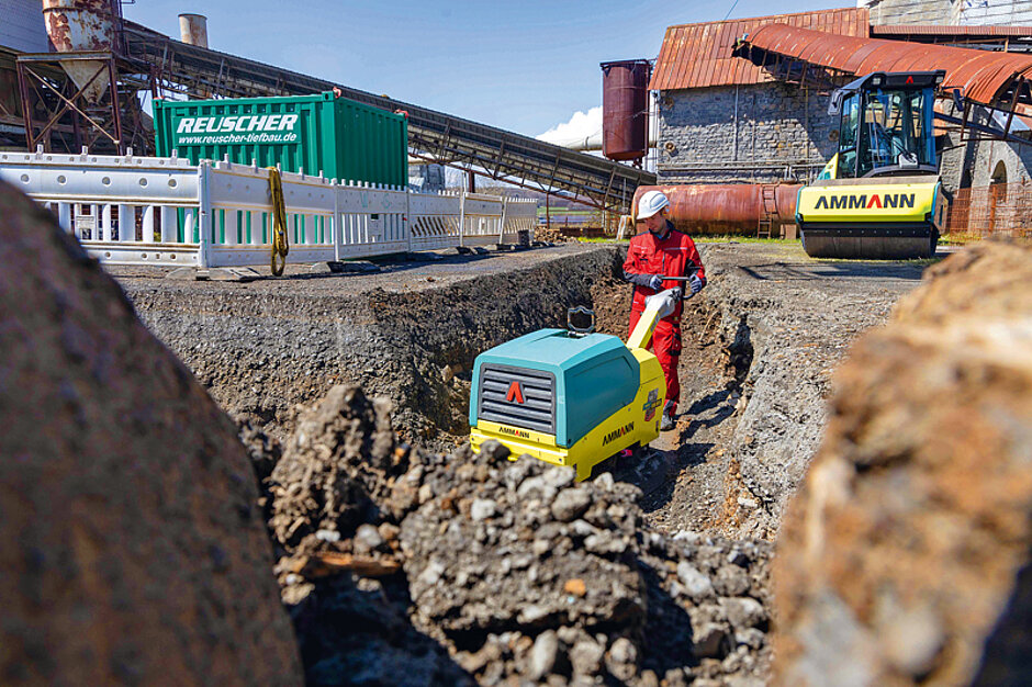 Seine neue Rüttelplatte hat Ammann auf Herz und Nieren unter Realbedingungen getestet. In den verwinkelten Ecken und Hanglagen des Tertiär- und Industrieerlebnisparks Stöffel im Westerwald musste sie ihre Wuchtkraft, Wendigkeit, Steigfähigkeit und leichte Handhabung beweisen. Die Ammann-Spezialisten loten bewusst die Grenzen der neuen Maschine aus.