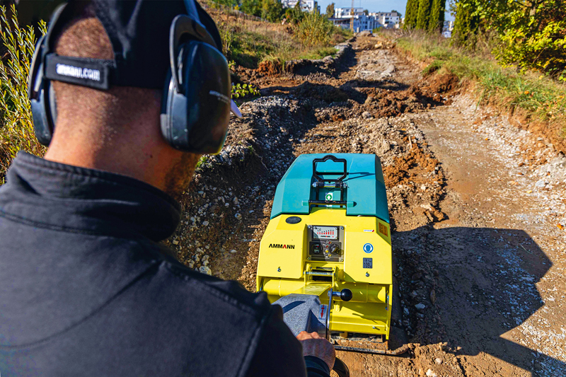 Azubis ohne Baustellenerfahrung wurden zudem für einen »Handhabungstest« ausgewählt. Eine kurze Einweisung genügte und mit leichter Hand führten sie die Platte punktgenau an Gebäuden entlang. Die kompakte Bauweise der Maschine in Kombination mit der serienmäßigen hydrostatischen Orbitrol-Steuerung wusste hier ihre Stärken auszuspielen. Damit soll sich diese neue Rüttelplatte stufenlos steuern sowie bequem und sicher führen lassen. Selbst Kurven sieht Ammann geschmeidig zu meistern. »Durch die niedrige Bauweise können Bediener im schweren Verbau auch die Stahlverstrebungen großer Gräben bequem unterfahren«, bestätigt Ohlraun.