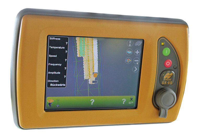 Anschließend folgt gleich die Walze mit intelligenter Verdichtungsmessung sowie Regelung und verdichtet die Asphaltschicht im genau richtigen Maß. Sensoren in den Ammann-Walzen messen die Temperatur und die entwickelte Verdichtungsenergie. Diese Daten werden in die Topcon-Walzensteuerung übernommen. Die Zahl der Überfahrten kommt aus der GNSS-Position der Walze. Die Bestandshöhe wiederum wird über hochsensible Sensoren wie der Sonic Tracker ST-3 gemessen. Auch Wetterdaten fließen in die Planung mit ein – etwa bei aufkommendem Regen oder starkem Wind.