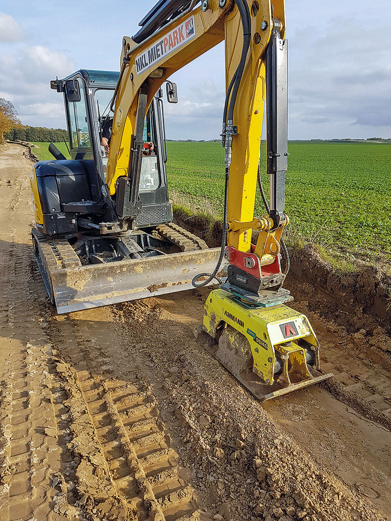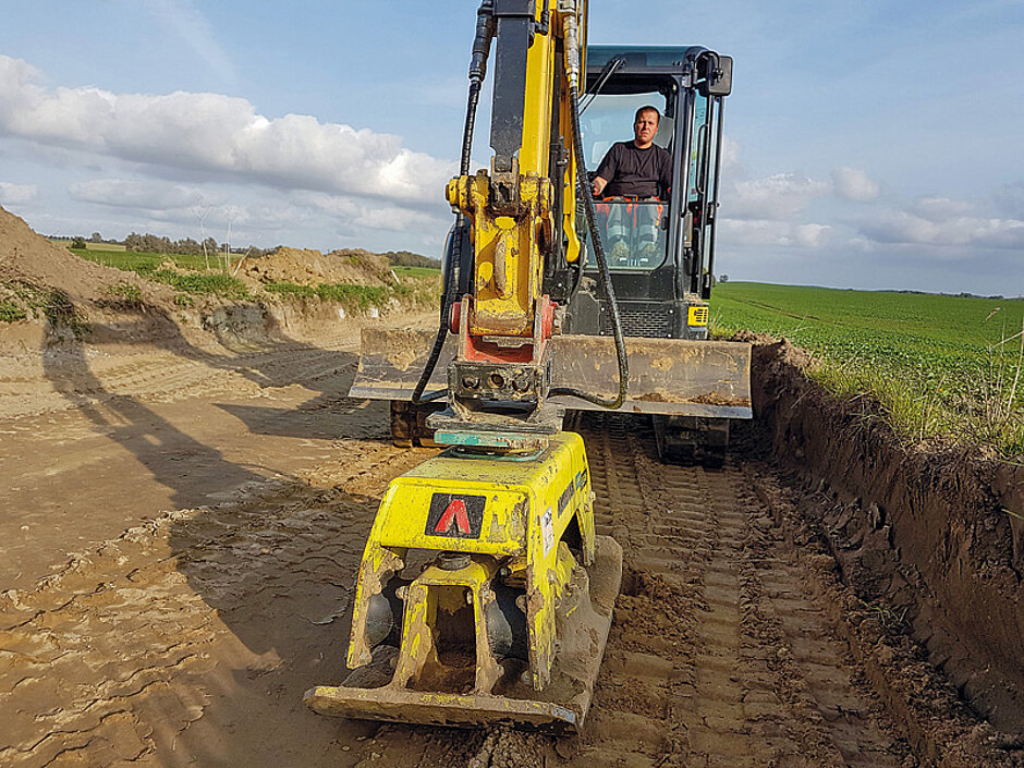 »Unser Kunde erkundigte sich nach einem für die Baustelle geeigneten Anbauverdichter. Wir hatten zwar für die gewünschte Arbeitsbreite nicht das passende Gerät im Mietpark, doch ich habe durch mein Netzwerk schnell den richtigen Verdichter finden können. Durch unsere Beziehungen zur Firma Ammann konnte Gebietsverkaufsleiter Arnd Kruse gemeinsam mit uns dem Kunden die perfekte Lösung für sein Bauvorhaben anbieten«, so Braun. Da bei HKL hydraulische Anbaugeräte wie der Anbauverdichter nur mit einem passenden Trägergerät vermietet werden, kam der APA 5546 mit einem Yanmar Vio50-Kompaktbagger auf die Baustelle. Hier zeigte sich bereits ein Vorteil des Ammann-Verdichters: Dank seiner universellen Adapterplatte lässt sich der APA 5546 schnell an alle herkömmlichen Schnellwechselsysteme anschließen – hier war der Verdichter mit seiner Wechselplatte an einem mechanischen Schnellwechsler MS 03 von Lehnhoff befestigt.