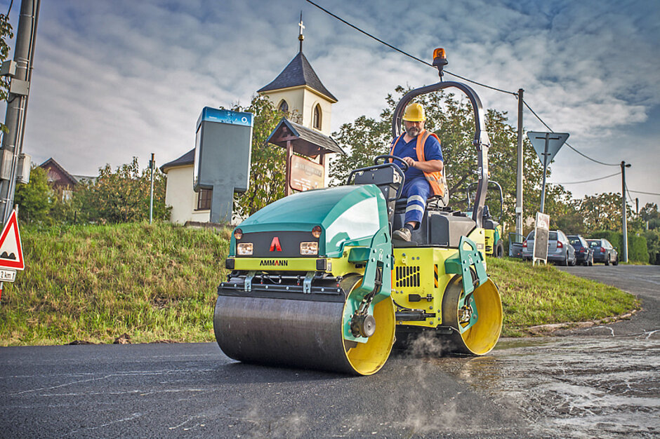 Durch den Versatz der Bandagen von bis zu 40 mm lassen sich auch Verdichtungsarbeiten entlang Bordsteinen oder Kanten sicher erledigen. Ein seitlich verstellbarer Fahrersitz erlaubt eine weiter verbesserte Sicht auf die Bandagen und ebenso auf die Arbeitsfläche. Optional sind alle leichten Tandemwalzen von Ammann mit ACEforce ausgestattet. Die integrierte Verdichtungskontrolle ermittelt den Verdichtungsgrad der zu verdichtenden Schichten in Echtzeit. Unnötige Walzgänge und Überverdichtungen werden damit vermieden. Selbst erfahrene Maschinenführer sollen somit an Sicherheit und Geschwindigkeit gewinnen können. Ein Plus, gerade bei Asphaltarbeiten, ist darüber hinaus der elektronische Fahrhebel, der ein sanftes Anfahren und Abbremsen der Maschine und dadurch eine optimale Oberflächenebenheit unterstützt.