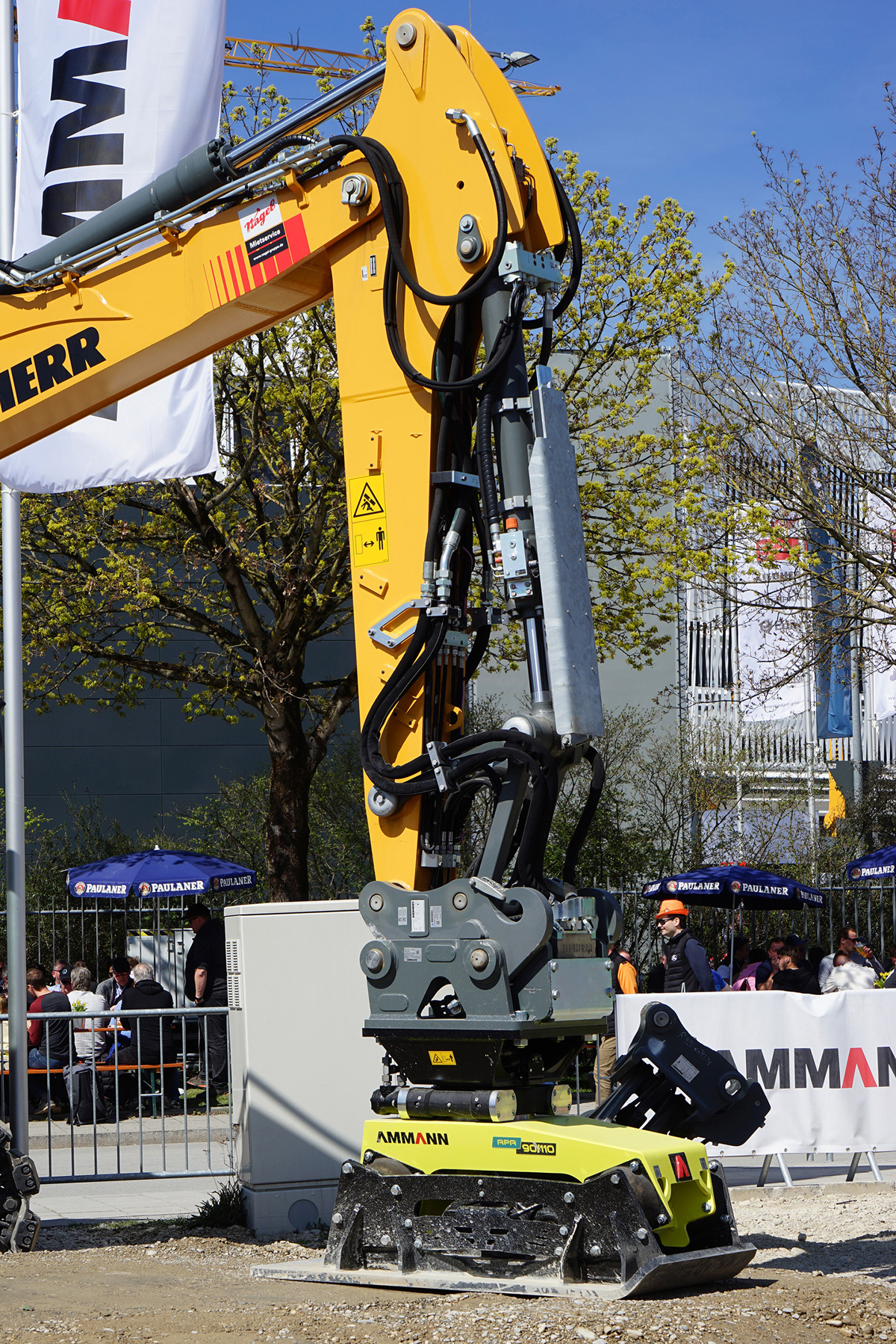 Neuigkeiten gibt es auch bei den Anbauverdichtern. Die Modelle APA 90/110 und APA 110/110 haben statt einem hydraulisch angetriebenem Rotator nun ein Schneckengetriebe mit zwei Antriebsmotoren. Zusammen mit der volhydraulischen 3-Wellen-Technologie von Ammann erreichen die Anbauverdichter eine hohe Verdichtungsleistung. Durch die reduzierte Bauhöhe kommen sie dabei noch besser unter überhängende Strukturen im Graben und können auch sehr nahe an Gebäuden verdichten. Die innenliegenden Hydraulikleitungen sind geschützt vor Beschädigungen, und die Tiltrotator-Ready-Ausstattung erhöht die Flexibilität beim Anbau. So spart man Umrüstkosten und kann den Anbauverdichter direkt am Bagger einsetzen.