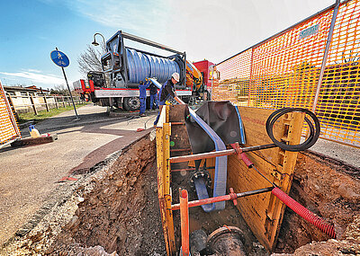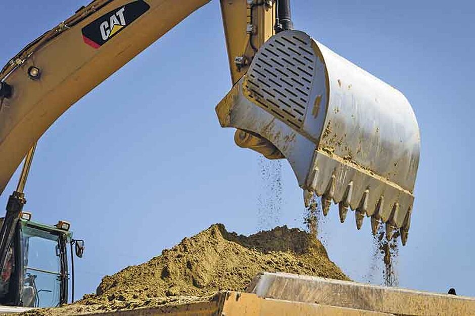 Eine Ladung des Rädlinger-Löffels mit Schnittbreite 1,9 m fasst bis zu 3 m³ Erdreich. Für die Entstehung der 7,6 km langen Ortsumgehung werden rund 350 000 m³ Boden bewegt. Dass es zügig vorangeht, freut wohl vor allem die Anwohner, denn die Ortsumfahrung reduziert das Verkehrsaufkommen vor ihrer Haustüre um nahezu 75 % und senkt damit auch die Lärmbelastung spürbar. Bevor allerdings die Asphaltdecke aufgebracht werden konnte, galt es 230 Schächte zu graben, 12 km Kanal zu legen und fünf Regenrückhaltebecken zu errichten. Hierbei war der vielseitige Anwendungsbereich der drehbaren Rädlinger-Grabenräumlöffel gefragt.