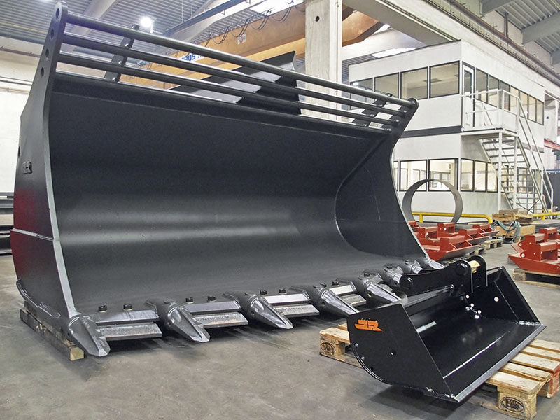 Über die Jahre hinweg hat die Maschinenbauhallen in der Oberpfalz eine Vielzahl solcher Anbaugeräte verlassen. Darunter waren Standardlösungen für Bagger mit Einsatzgewicht von bis zu 130 t und Individuallösungen für größte Baumaschinen von 180 t bis 260 t. Zwei kürzlich fertiggestellte und ausgelieferte Großanbaugeräte sind jetzt im Einsatz in Österreich. Angebaut an einen Komatsu PC 800 LC-8 verrichtet ein Felslöffel mit einer Schnittbreite von 2 m seine Dienste jetzt in einem Schotterwerk. Eine Füllung des komplett aus verschleißfestem Material gefertigten Löffelkorpus umfasst etwa 5 m³. Sechs Verschleißstreifen, Messerpanzerung und Verschleißeinsatz schützen den Löffel. Für die Verladung von Marmor in einem weiterverarbeitenden Produktionsbetrieb produzierte Rädlinger außerdem eine Felsladeschaufel mit einem Füllvolumen von 8 m³. Das Trägergerät der Ladeschaufel mit einer Schnittbreite von vier Metern ist ein Komatsu WA 600-6. Vorkehrungen gegen den Verschleiß sorgen auch bei diesem Produkt für eine langjährige und effiziente Nutzung.