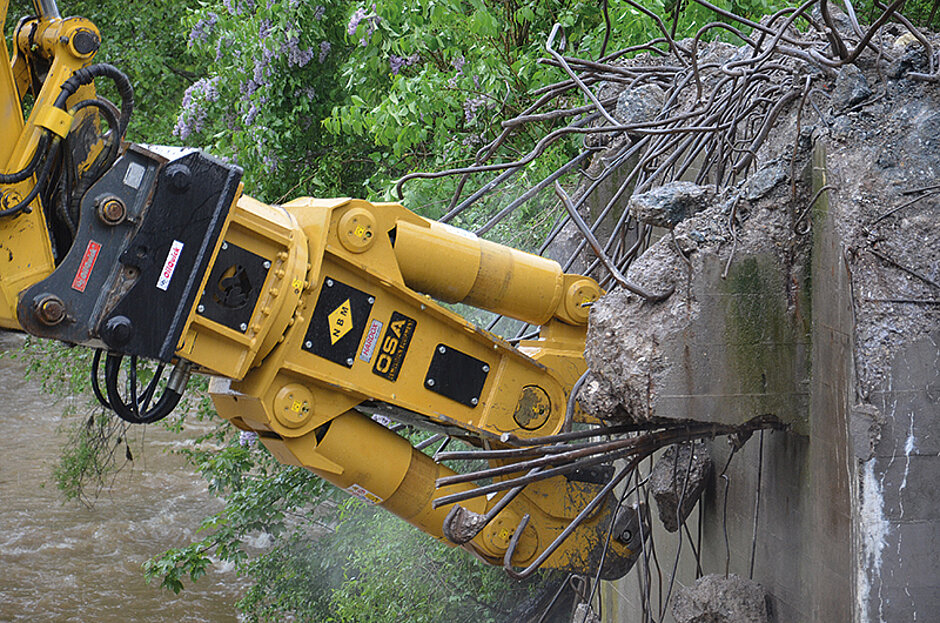 Wie erwartet, stellte der Abbruch der ersten Brücke für die kraftvolle Kombination aus starkem Trägergerät und optimalem Anbauwerkzeug keine besondere Herausforderung dar. Bei der Brücke am Riedberg-Pass mit einer Brückenhöhe von ca. 6 m und Betonstärken bis zu 1,5 m war allerdings zusätzlich der Einsatz von Treibladungskartuschen und insgesamt sechs Sprengungen nötig, um das Material soweit zu lockern, dass die Reste problemlos mit Schere und Pulverisierer abgetragen und zerkleinert werden konnten. Durch die Verwendung der Treibladungen konnte insgesamt eine Zeitersparnis von rund 40 % erzielt werden. Bei der dritten Brücke war allerdings voller Einsatz gefordert. Eine Konstruktion, die nur von einer Seite zugänglich war, mit bis zu 1,5 m mächtigen Widerlagern und einer extrem starker Armierung stellte enorme Anforderungen an Menschen und Geräte. Wie sich zeigen sollte, verfügten die neuen OSA-Werkzeuge aber über den richtigen Biss, um auch mit dieser Aufgabe fertig zu werden.