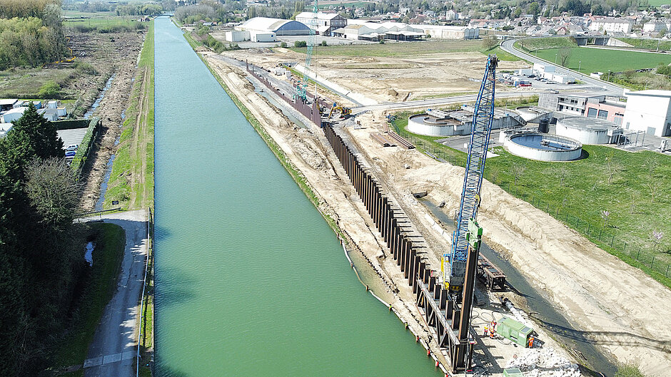 Der CO₂-Fußabdruck einer neuen Kaimauer am Seine-Nord-Europa-Kanal in Frankreich soll dank EcoSheetPile Plus ebenso erheblich reduziert werden. Die neue Wasserstraße wird die bestehenden französischen mit dem nordeuropäischen Wasserstraßennetz verbinden und soll Straßentransporte in Frankreich reduzieren, schließlich transportieren bereits wenige Frachtschiffe so viel Fracht wie 220 Lkw. Das HZ/AZ-Wandsystem von ArcelorMittal wird hier für den Bau einer 200 m langen Kaimauer eingesetzt. In Summe werden 910 t HZ 880M A-12 Königspfähle und AZ 13-770 Zwischenspundbohlen verbaut.