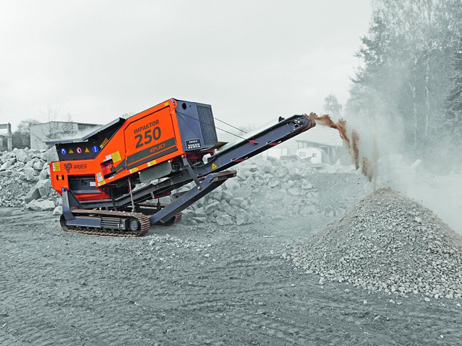 Neben einer speziellen Kombination aus Raupenmobilität und Hakenliftversion soll sich der Impaktor 250 Evo unter anderem durch ein innovatives Wellenschnellwechselsystem, eine neue Steuerung sowie ein ebenso neues Wellendesign auszeichnen, die alle zusammen die Anwendungsbreite des Zerkleinerers entscheidend erweitern sollen. Künftig stellt der Impaktor nicht nur eine Maschine zur Aufbereitung mineralischer Stoffe dar, sondern ist zudem in der Lage Müll, Holz, Altholz, Reifen, Matratzen und Leichtmetall zu zerkleinern. Mit Einführung des Impaktor 250 Evo wählt Arjes einen eher unüblichen Weg und senkt eigenen Angaben zufolge für die Neuheit den ausgelobten Preis. Parallel zur Vorstellung auf der Bauma wird der Zerkleinerer ebenso mit erhöhten Garantielaufzeiten und kostenoptimierten Verschleißpaketen ausgestattet.
