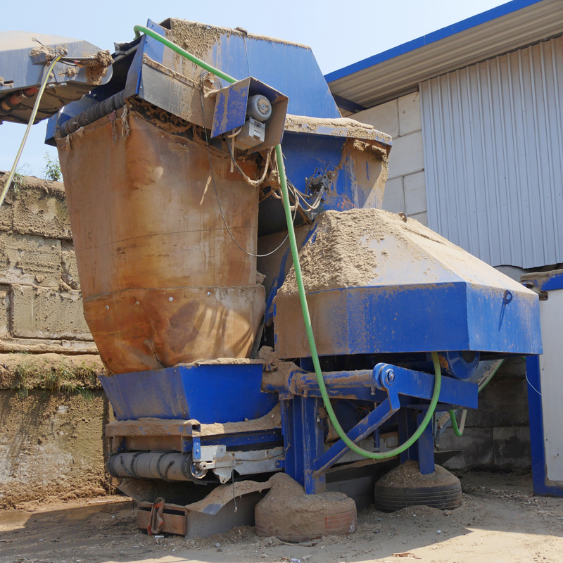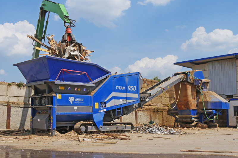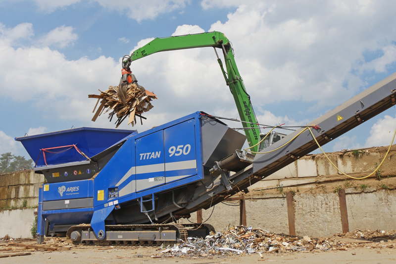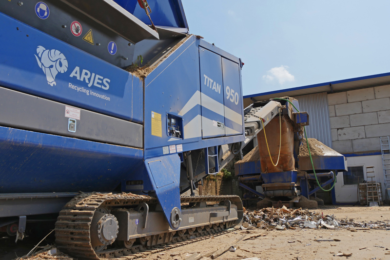Seine neueste Arjes-Anschaffung ist der Titan 950 in Kombination mit einer speziellen Hammermühle. Auch hier gab es viele Zwischenschritte und Anpassungen bis zur endgültigen Fertigstellung und dem Abschluss dieser Anlagenkombination. Mit durchschnittlich 100 t/h und einer Endkorngröße 0 – 100 mm ist die Anlage auf dem Recycling-Hof für die Zerkleinerung von Altholz im Bereich A1 bis A3 zuständig. Dank der Paddelwellen mit einem asynchronen Antriebssystem sorgt der Titan 950 für die Materialvorzerkleinerung. Enthaltene Metallteile lassen sich nach der Zerkleinerung mithilfe des Überbandmagneten leicht aussortieren. Im nächsten Schritt wird das Altholz über ein Scheibensieb geführt, bevor es zur nächsten Zerkleinerungsstufe geht. Material mit Korngrößen unter 100 mm fällt somit direkt durch, um diesen Prozess zu umgehen. Alles, was größer ist, wird dagegen mit der Hammelmühle nachzerkleinert und bringt die gewünschte Qualität, die der Kunde für sein Endprodukt vorsieht. Hier sorgen ein weiterer Überbandmagnet sowie eine Magnetrolle im Abwurf dafür, dass eventuell noch enthaltene Metallteile, wie Schrauben oder Nägel, aussortiert werden.